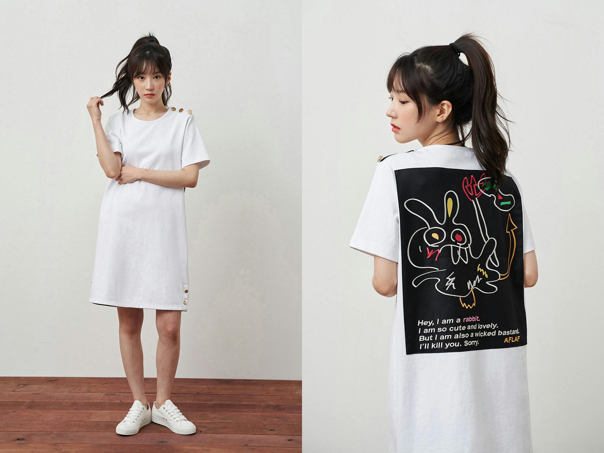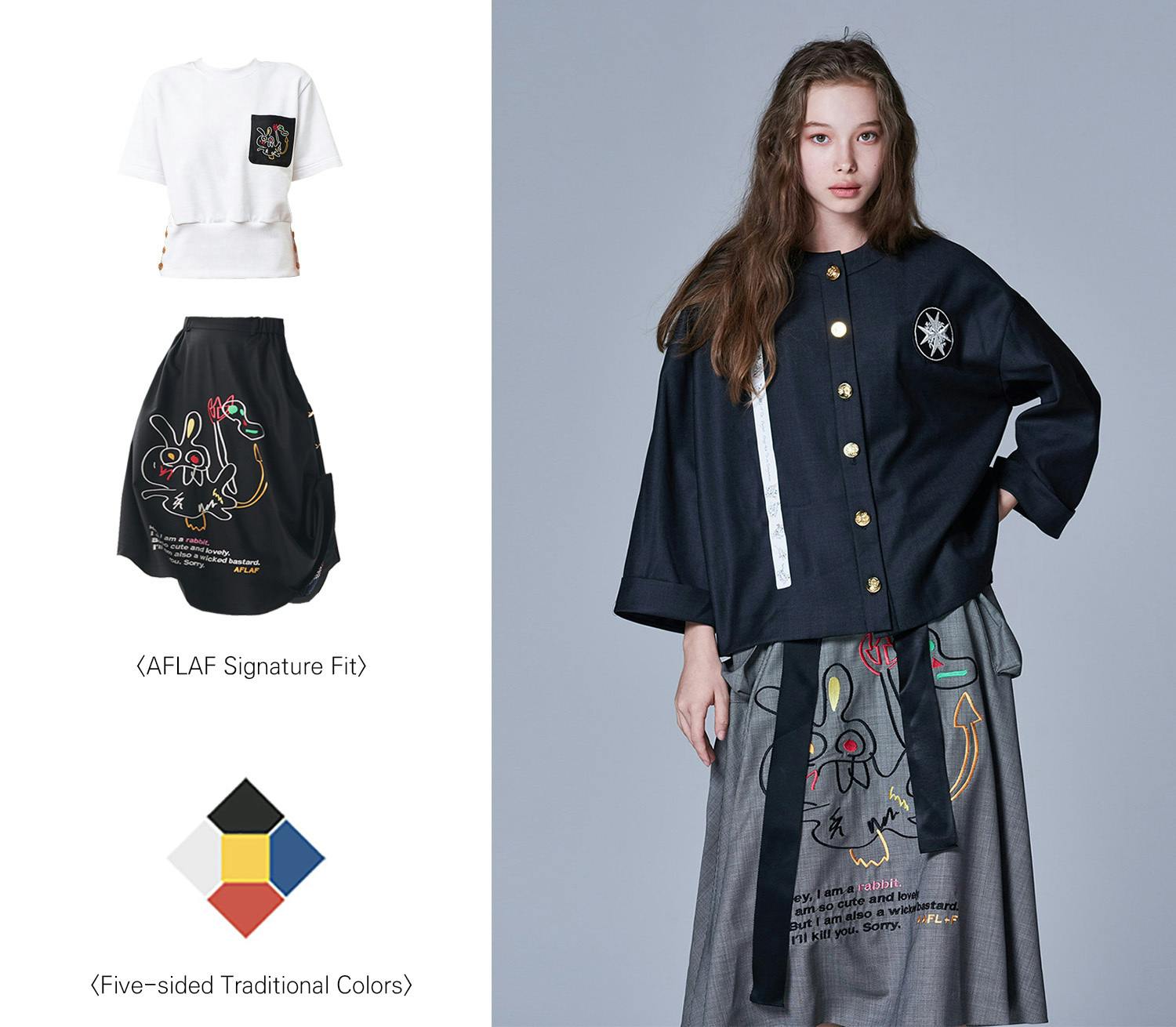 「AFLAF」のすべての製品にはこのデビル・ラビットの精神が含まれています。黄金のボタン、裏地、刺繍、プリントなどでデビル・ラビットは「私たちは、決して弱くない」、「私たちはみんなは大切な存在だ」というブランド価値とメッセージを伝えているのです。