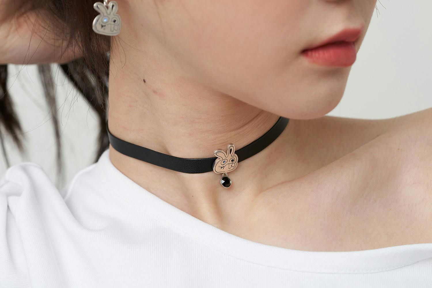 ▶ 青いクリスタルの瞳を持ったデビル・ラビットの顔と黒いクリスタルがあなたの首に視線を集中させます。レザー素材で首を包んでくれるチョーカーネックレスは、長さを自由自在に調節でき、調整する部分にはピンクの三枝槍があり、後ろ姿まで個性的に演出ができます。