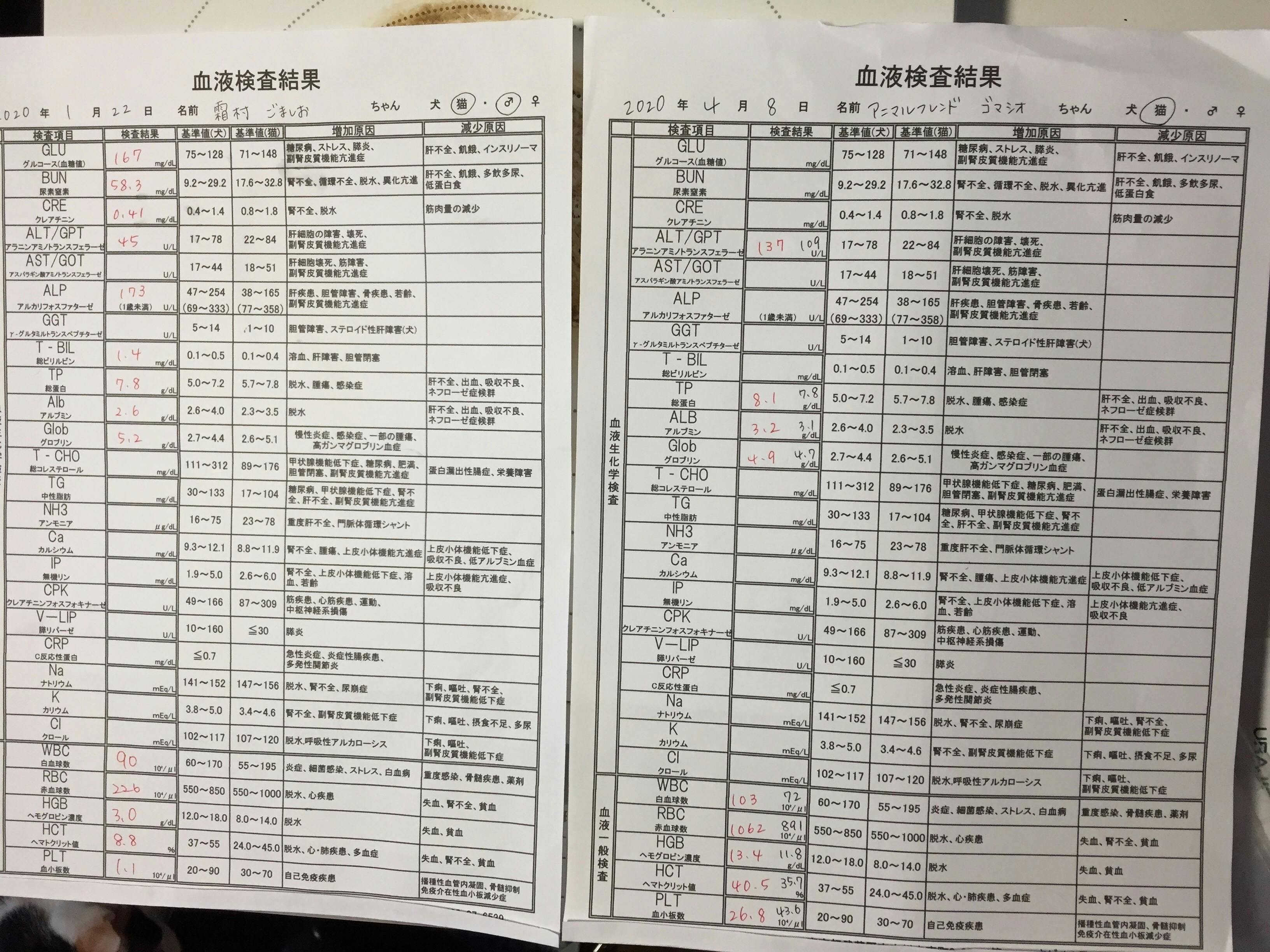 ⬇️ごましお君の投薬開始前と最新の血液検査の結果