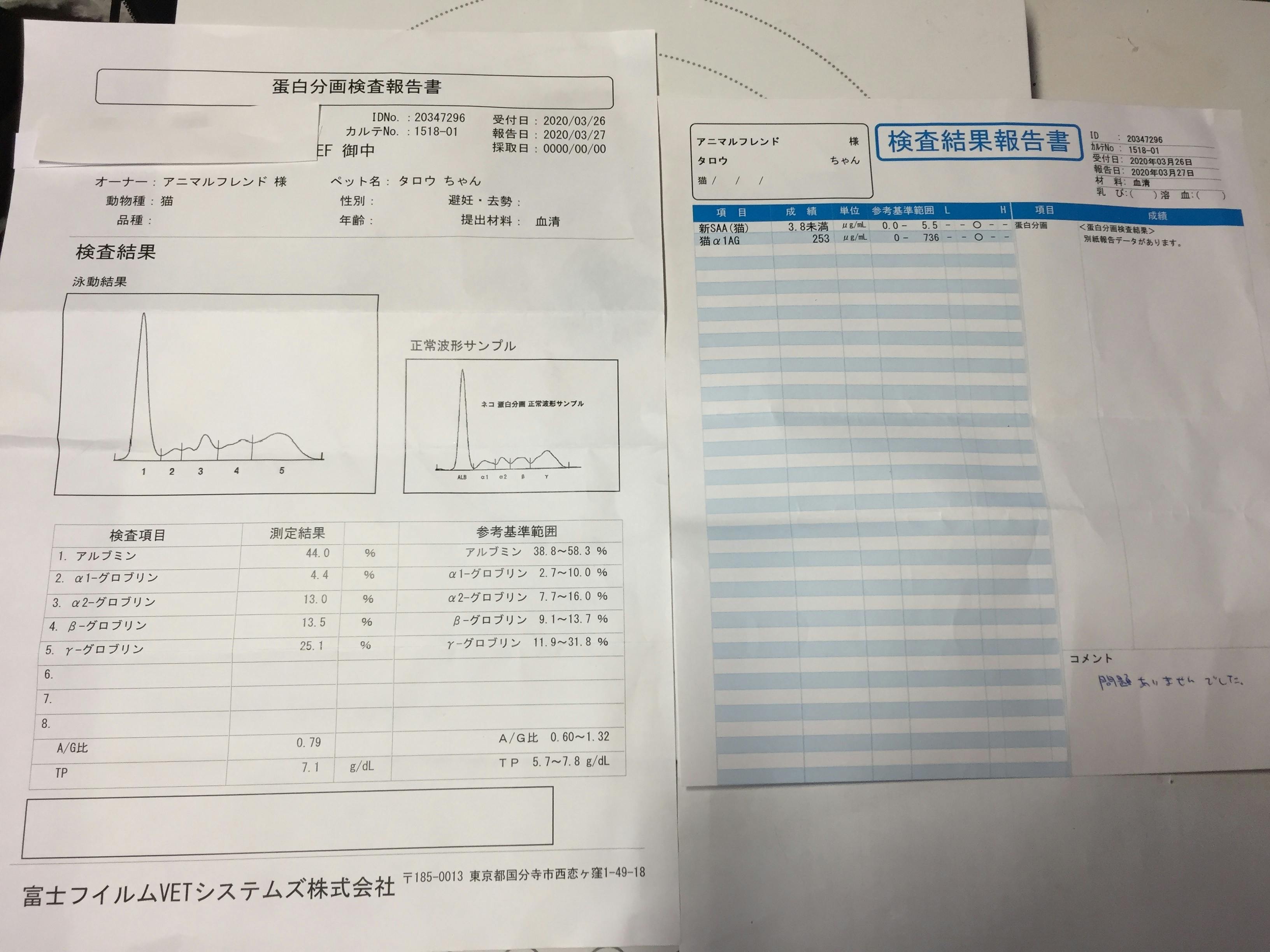 2020年1月末に高熱、ブドウ膜炎、貧血ありドライタイプFIPを発症。 2020年2月4日に投薬開始。貧血改善のためエスポー注射(6回)、現在体調は安定。4月27日投薬終了予定。その後3ヶ月間の見守り期間に。その間、4回の血液検査実施予定。