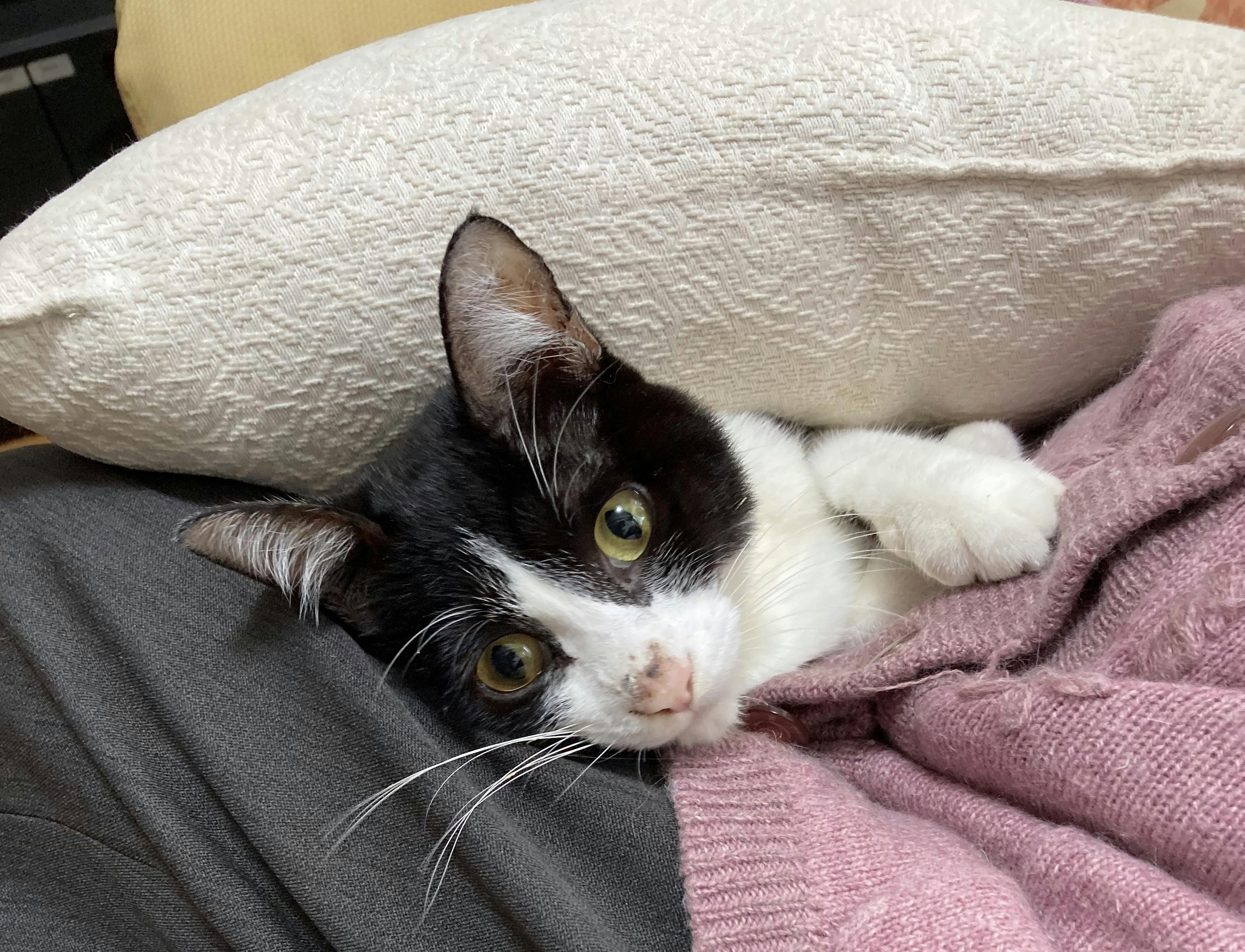2019年9月に保護。現在推定8ヶ月。2020年2月に大量の腹水が溜まりウェットタイプFIPを発症。2月15日投薬開始。投薬後約10日で腹水が消滅。肝臓の薬ウルソ錠投薬。現在体調は安定し、5月8日投薬終了予定。その後3ヶ月間の見守り期間に。その間、4回の血液検査実施予定。
