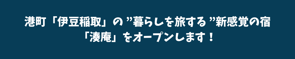 これからの時代に、より多くの宿泊してくれるみなさんに「湊庵」で古き良き稲取の暮らしを体感してもらい、人生をより豊かにするヒントを手に入れてほしい!地元のみなさんにはそれを誇りに感じて暮らしてほしい!そんな思いで、湊庵を開きます!!