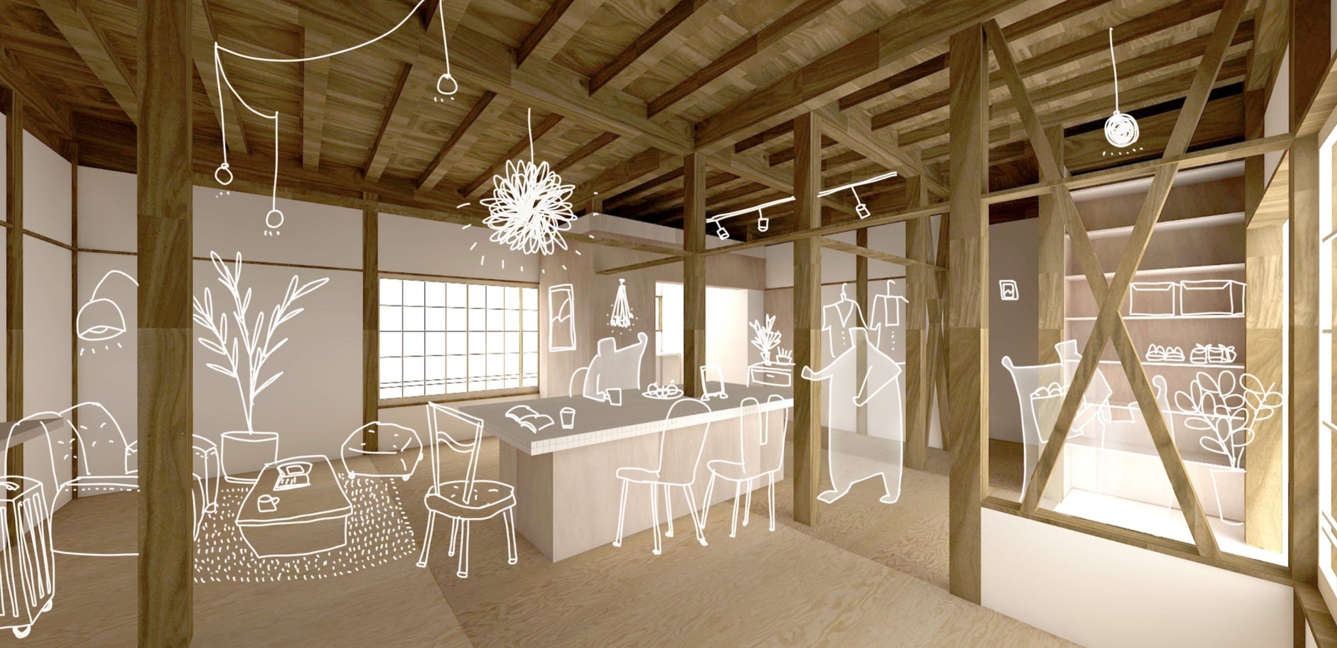 1階は、地域に開けたオープンな空間となっており、宿泊の他にもワークショップやポップアップストアなどとイベントスペースとして使えたり、ワークスペースとして落ち着いて仕事ができる空間にします。