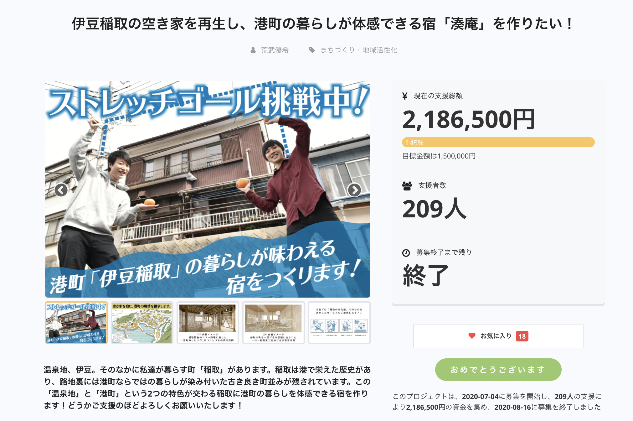2020/08/17 21:508/16(日)を持ちまして、我々のクラウドファンディングが終了となりました。結果はSUCCESS!!たくさんの方々からのご支援のおかげで総支援金額2,186,500円を達成することができました。一ヶ月半のプロジェクト期間、いろいろな経験をさせていただくことができ、同時にたくさんのことを考える時間が得られました。ストレッチゴールとして設定した300万円に到達できなかったことは、めちゃくちゃ悔しかったですが、この悔しさを味わえたことも一つ勉強になったと考え、みなさんからの期待という名のご支援に応えるべくより一層邁進していく所存でございます。ここから荒武の恩返しはスタートします!!引き続き楽しみにしていてください。今後の情報発信は湊庵のウェブサイトやSNSで行っていきます。そちらを今後もチェックいただき引き続き面白がっていただけたら幸いです。この度は我々のクラウドファンディングにお付き合いいただきましてありがとうございました!!※随時リターンの準備を進めてまいりますので、こちらもお楽しみにお待ち下さい!! もっと見る