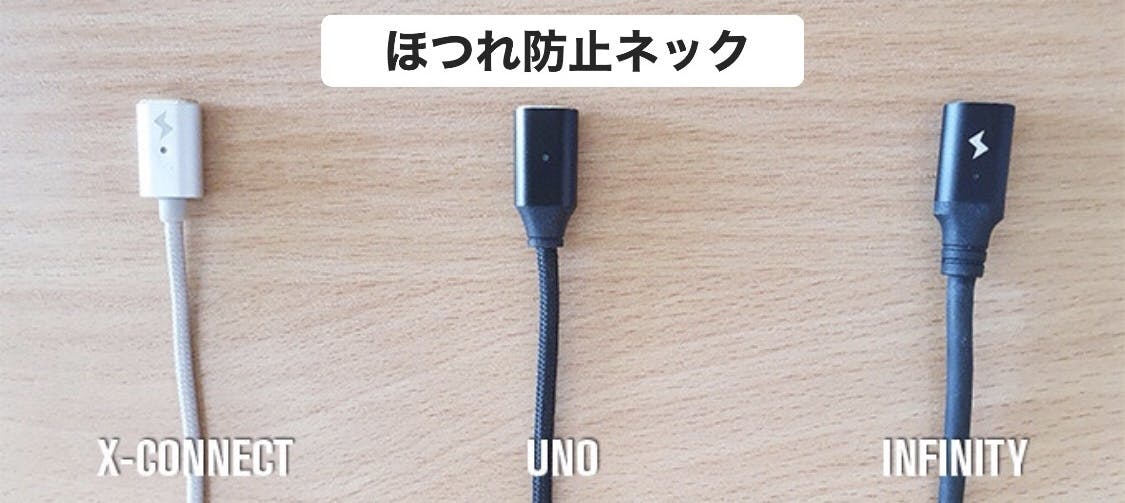 インフィニティケーブルは、一番もろく、ほつれたり切れたりしやすいネック部分にほつれ防止機能を搭載しています。このほつれ防止ネックの機能はケーブルの寿命を著しく伸ばします。UNOに比べ、私たちはこのほつれ防止ネックの磁力を妥協することなくより太く耐久性のあるものに改良しました。