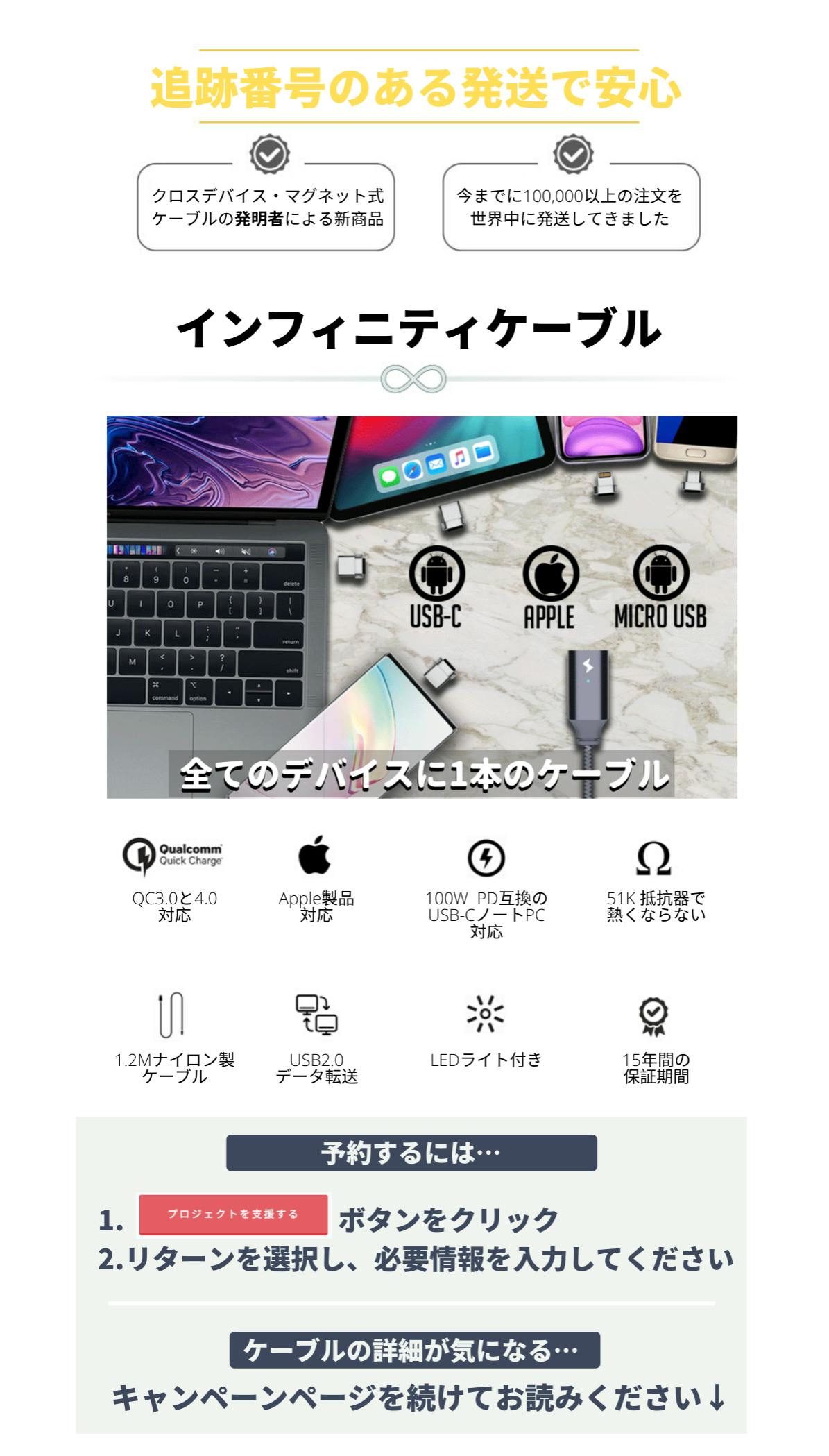 私たちはこの4年間改良を重ね、マイクロUSBやApple、USB-C、そしてあなたの最大の兵器であるUSB-Cラップトップに対応する強力なUSBケーブルを開発しました。インフィニティケーブルはQC 3.0と4.0に対応するだけでなく、今までで初めて最大100Wに及ぶ電力供給にも対応しています。UNOやFlashに続けて今回CAMPFIREにてキャンペーン開始が決定しました。