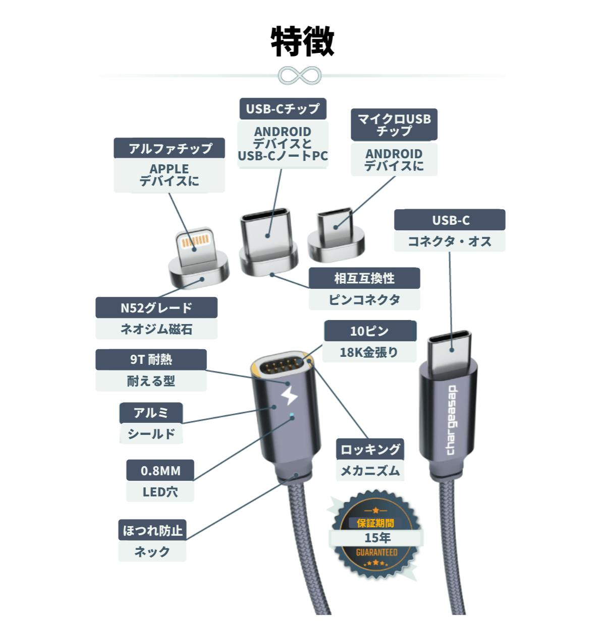 新しいケーブルでは磁力をアップグレードしました。また革新的なロック機能を組み込むことにより、より一層強い接続と寿命をもたらします。また、このより強い磁力は、より長いケーブルの使用も可能にします。各ケーブルセットは1.2mのケーブルが付属しオプショナルで2mのケーブルも購入可能です。ケーブルも30,000回から40,000回接続できるよう改造。あなたのデバイスより長生きする…かもしれません。