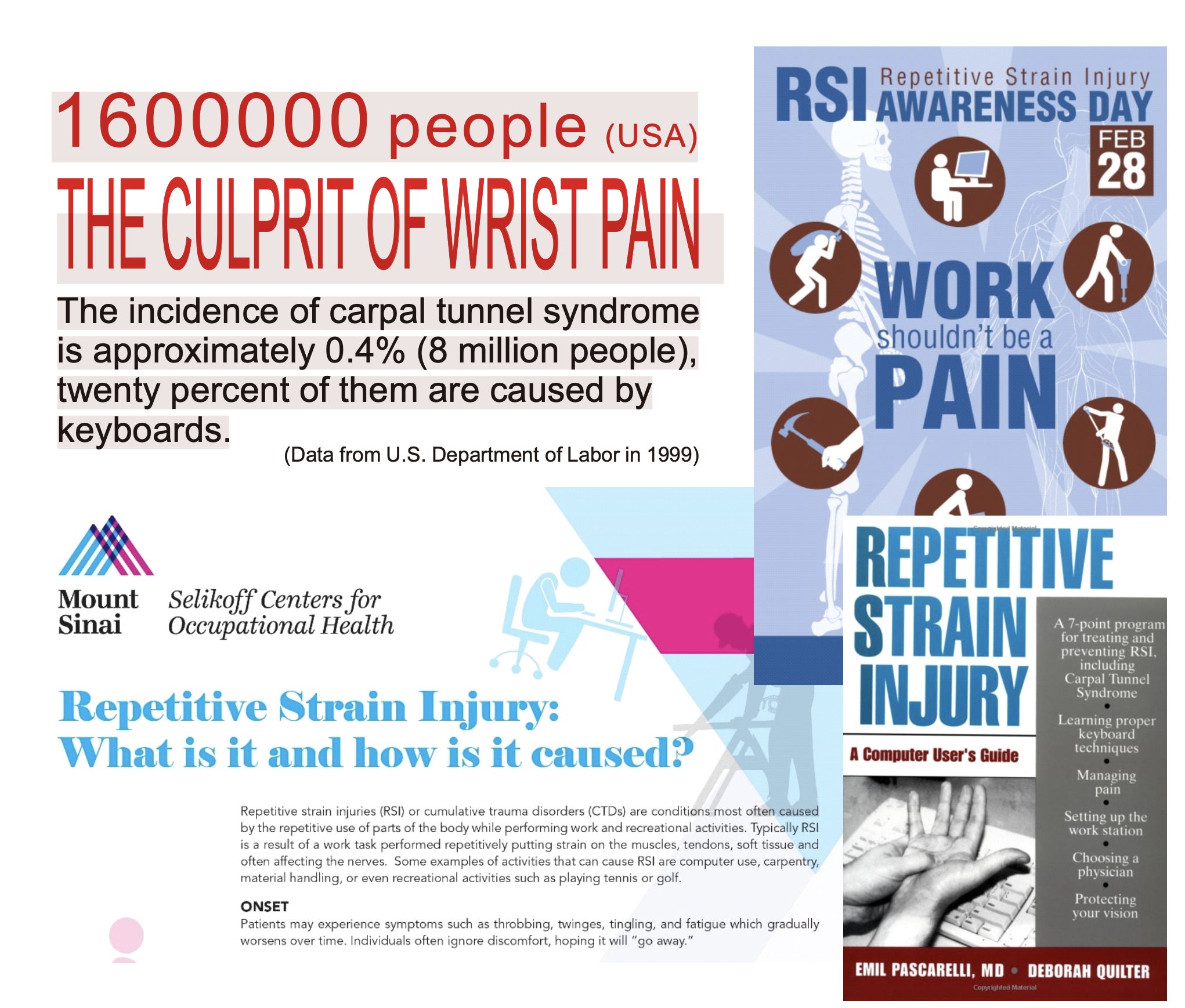 160万人(米国)の手首の痛みの原因(手根管症候群)の発生率は約0.4%(800万人)で、そのうちの20%はキーボードが原因です。