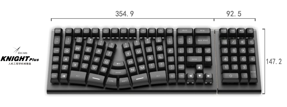 諸説ありますが、従来のキーボードを使用する場合、86の神経と、22の腱を使用すると言われています。現代社会で必須となっているキーボードは、人体にどれほどの負担をかけているのでしょうか。「X-BOWS KNIGHT Plus」は人間工学に基づき、体に優しいキー配列になっています。特にみなさんがよく使用するENTERキーやBACKSPACEキーは、右手の薬指や小指で押す方が多いと思いますいが、ここに大きな負担があります。「X-BOWS KNIGHT Plus」は右側にもENTERキーやBACKSPACEキーがありますが、中央にも配置してありますので、親指で自然にENTERキーやBACKSPACEキーを押すことができます。