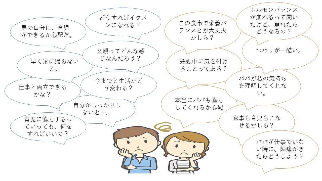 ①妊婦体験や沐浴体験を通して、子育てに対するパートナーの理解を深め、イクメン意識を高める。