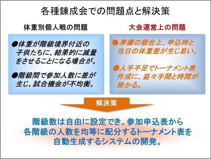 これらの問題を解決すべく、参加申込表から、各階級の人数を均等に配分する組み合わせ表を、自動生成するシステム「育成型自動抽選システム(ADSJ)」を作り、子供たちにも保護者にも、そして大会を運営する側の方々にも、是非喜んでいただきたいと思っています!