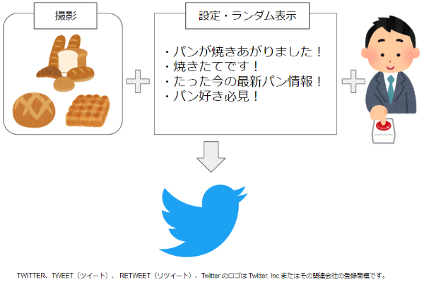 今回このプロジェクトを立ち上げたきっかけですが、私が真っ先に考えたことが「パン屋で、パンが焼き上がったのをもっと簡単にツイッター に投稿できないの?」ということです。