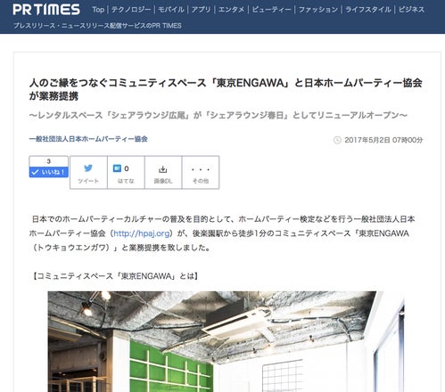 東京ENGAWAの3Fのパーティーエリアをプロデュースして頂いた一般社団法人日本ホームパーティー協会さんとホームパーティー文化を広げていく活動をしていくことで提携いたしました。 人のご縁をつなぐコミュニティスペース「東京ENGAWA」と日本ホームパーティー協会が業務提携 https://prtimes.jp/main/html/rd/p/000000281.000016067.html