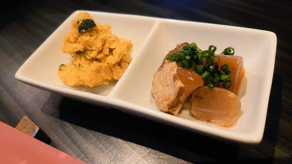 ↑お通し一例 かぼちゃサラダと豚軟骨煮込み