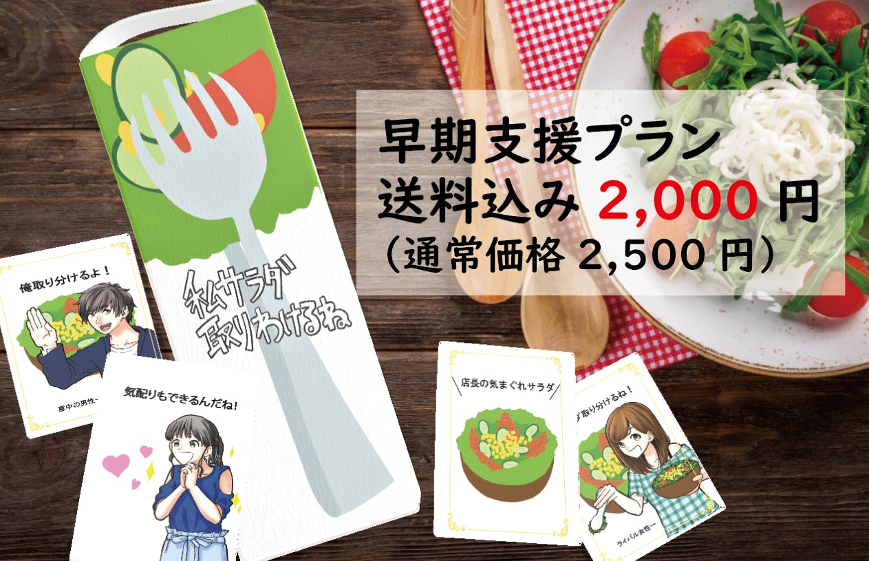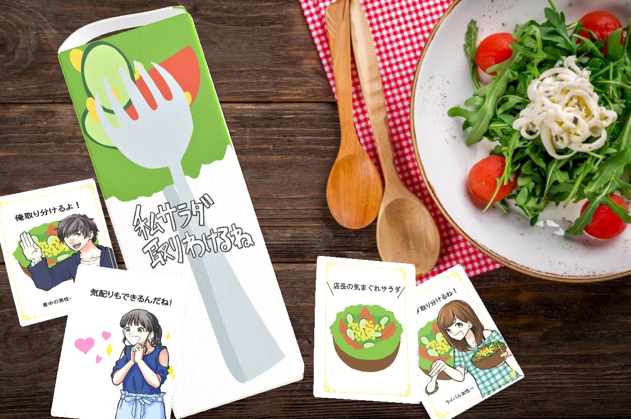 この度は個人的に制作し、遊んでもらっていた「私サラダ取り分けるね」というゲームに対し、有難いことにたくさんの商品化希望の声をいただいたこともあり、プロジェクトを立ち上げた運びです。