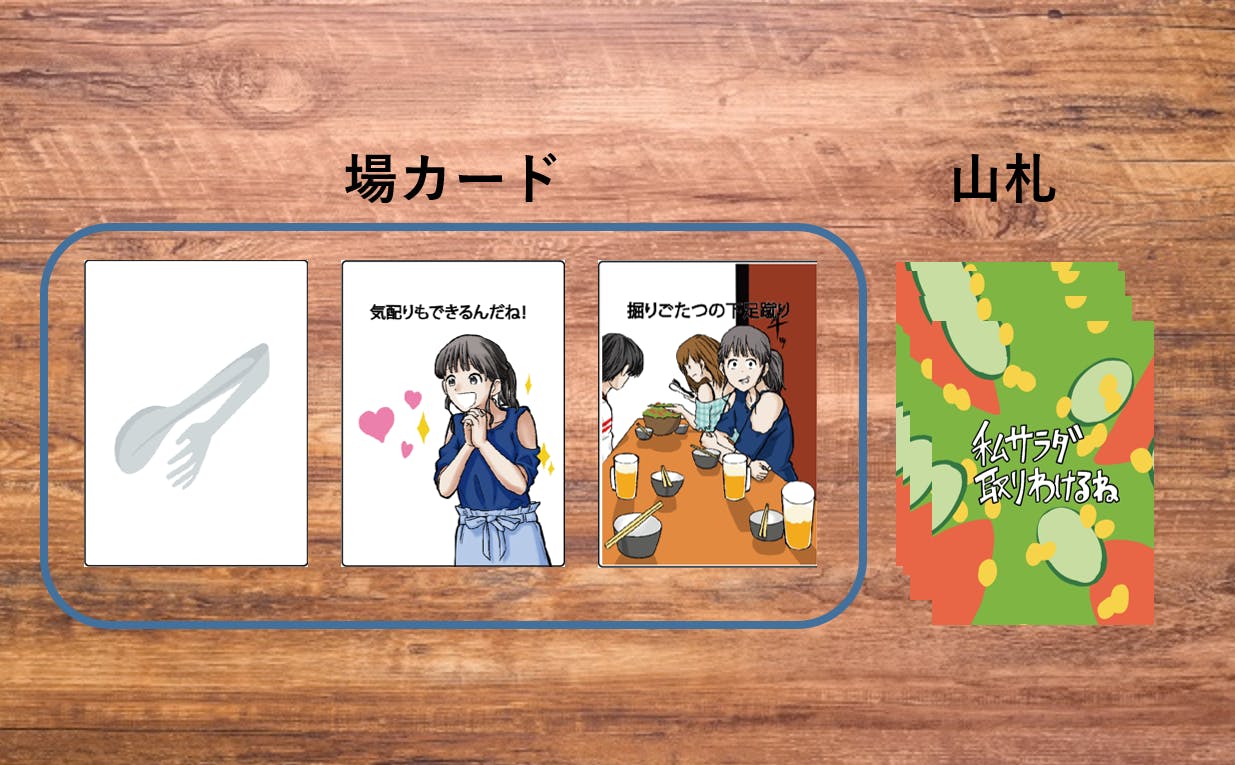 場に下の3枚を出し、他はシャッフルして山札にします。