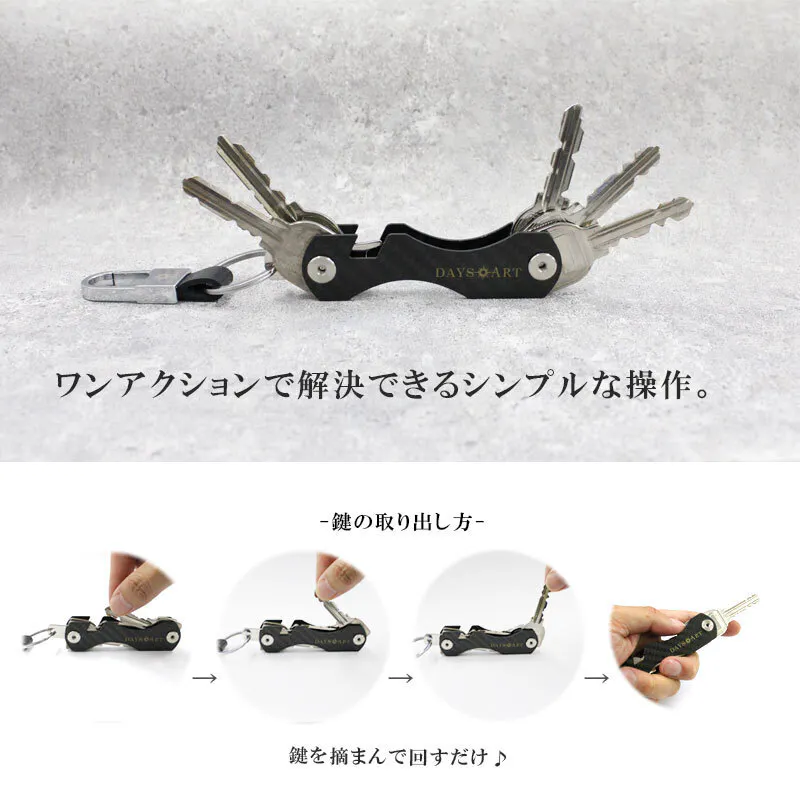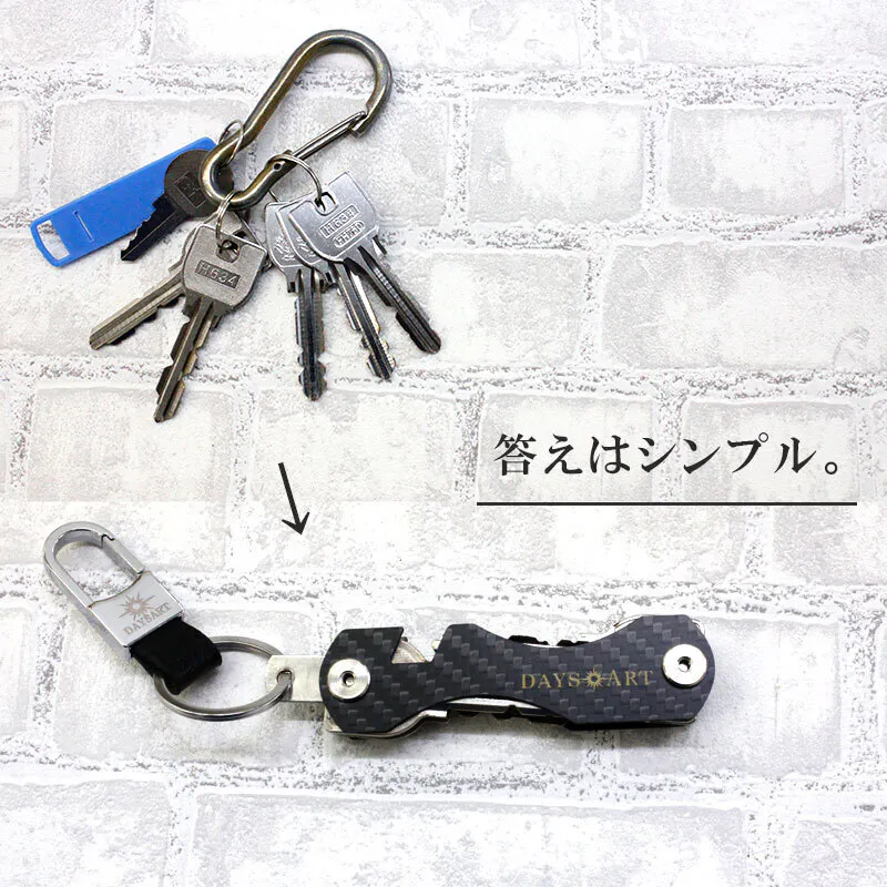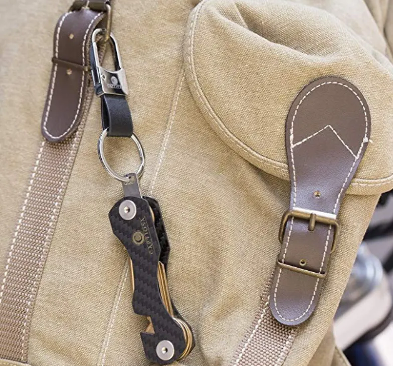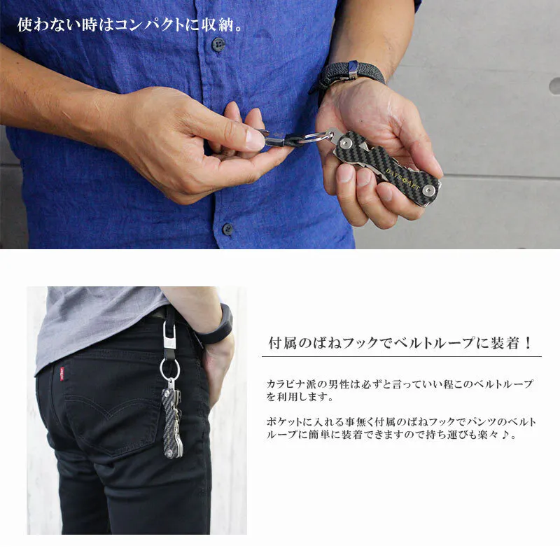キーケースの大きさを嫌がる男性は必ずといっていいほど、カラビナにぶら下げてます。それは『鍵を持ち歩く』のに脱着できて便利だからです。