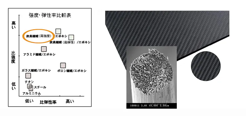 炭素繊維の特長は、何と言っても軽くて強いこと。比重が1.8前後と鉄の7.8に比べ