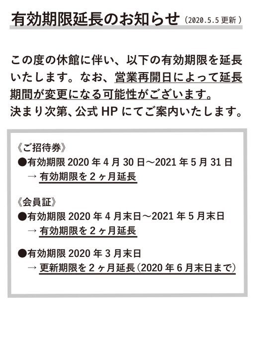 招待券・モナカアイス引換券・ポスター引換券には、来年6月末までの期限が印字されております。万が一休館が7月以降まで延長になる場合には、有効期限を延長いたします。その場合の具体的な延長期間につきましては、営業再開後に改めてご案内させていただきます。
