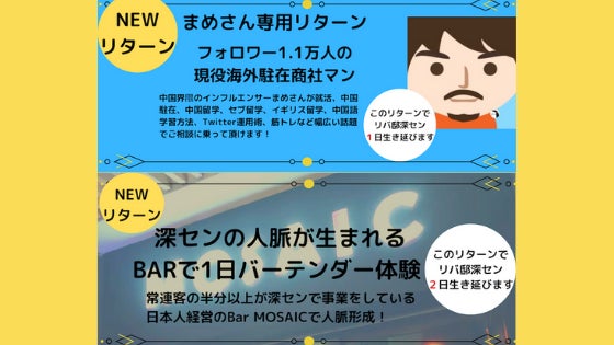 前回のRIEさんの友情出演的リターンに引き続き、今回は中国ビジネス界隈のインフルエンサーのまめさんと深センの日本人経営のBAR MOSAICからご厚意でリターンにご協力していただくことになりました!