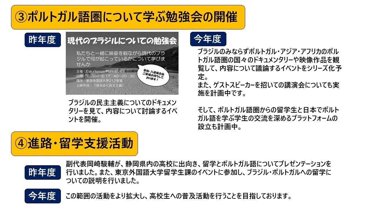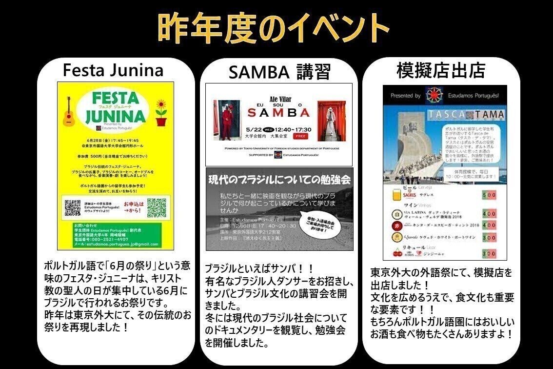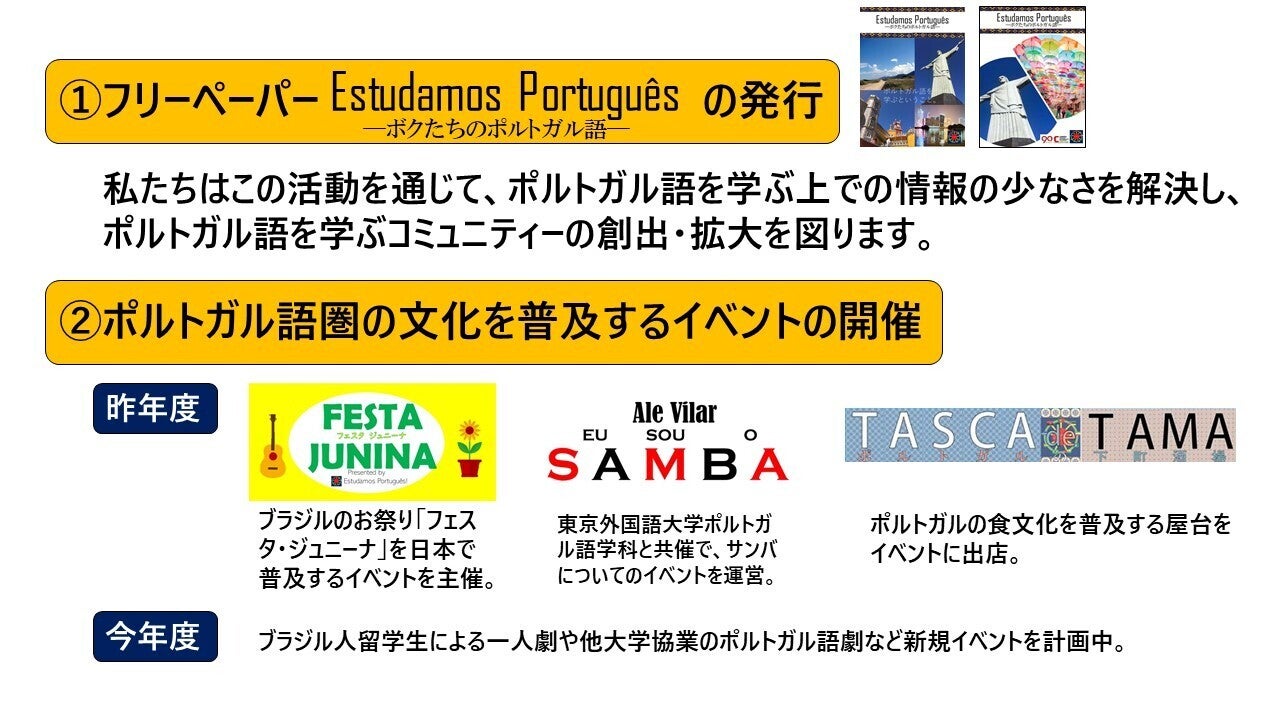 私たちは、ポルトガル語・ポルトガル語圏文化の普及とポルトガル語を学ぶ学生とポルトガル語圏出身者の交流を目的に、2018年9月に設立された学生団体です!