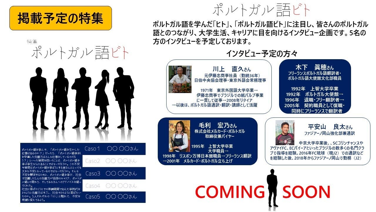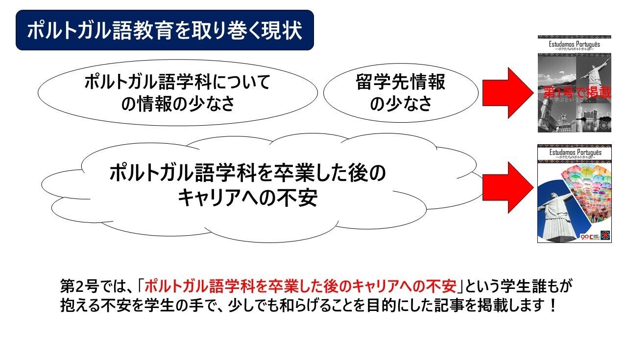 私たちのフリーペーパー「Estudamos Português-ボクたちのポルトガル語-」は、多くの皆さまのご支援の甲斐あって、昨年9月に第1号を発刊することができました。第1号は100ページからなり、「ポルトガル語を学ぶ際の不安解消」と「留学先選びの情報提供」を目指した2つの特集を中心とした全100ページから構成されております。第1号に関しましては、3000部の発行を行うことができました。