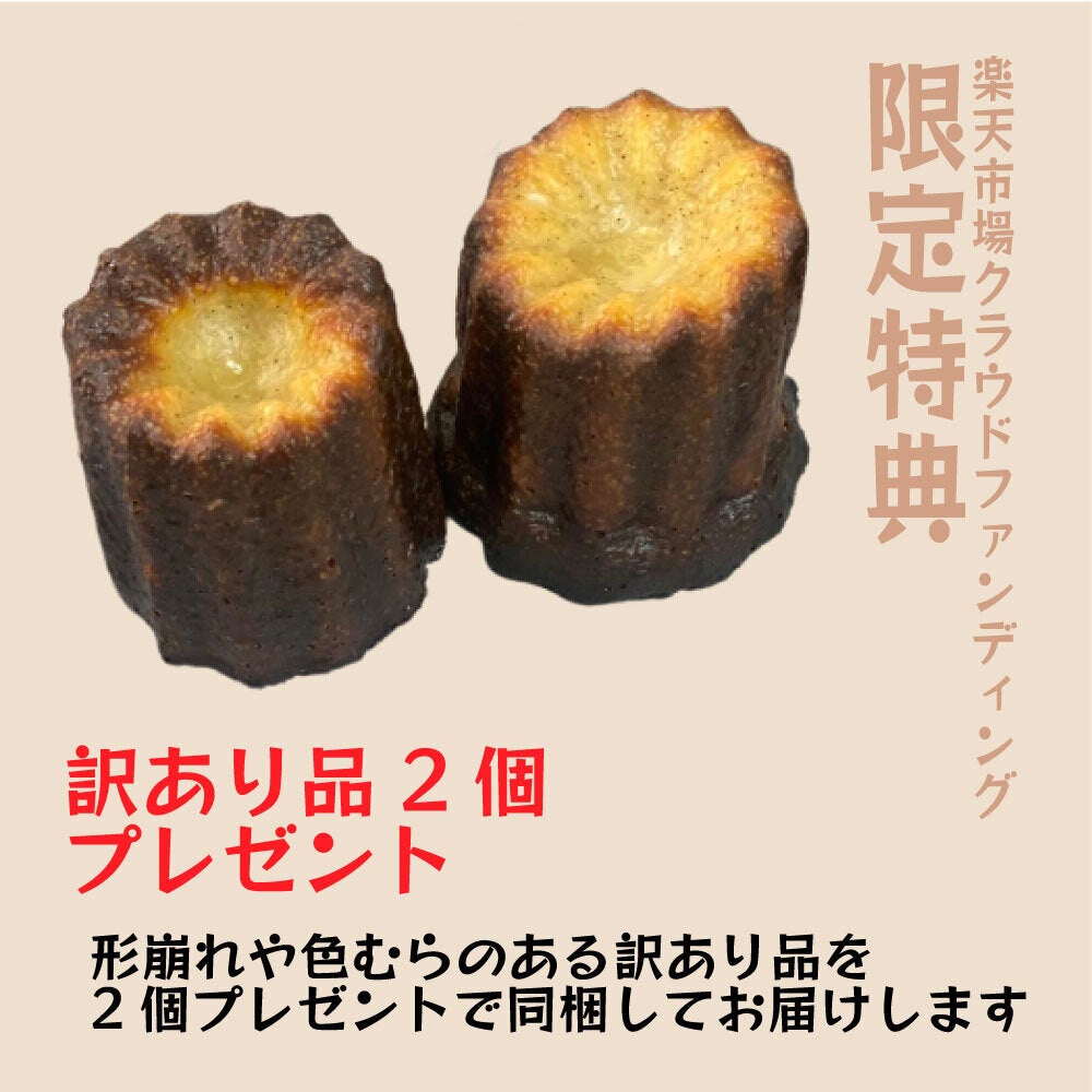この楽天市場クラウドファンディングの特典は訳あり品のカヌレが2個プレゼントでついてきます!変わらず美味しい味わい!