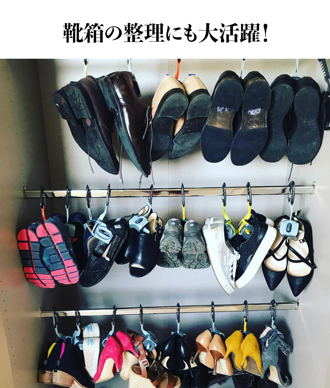 靴箱がいっぱいの方は何個も買って、壁に吊り下げ並べるのもOK!