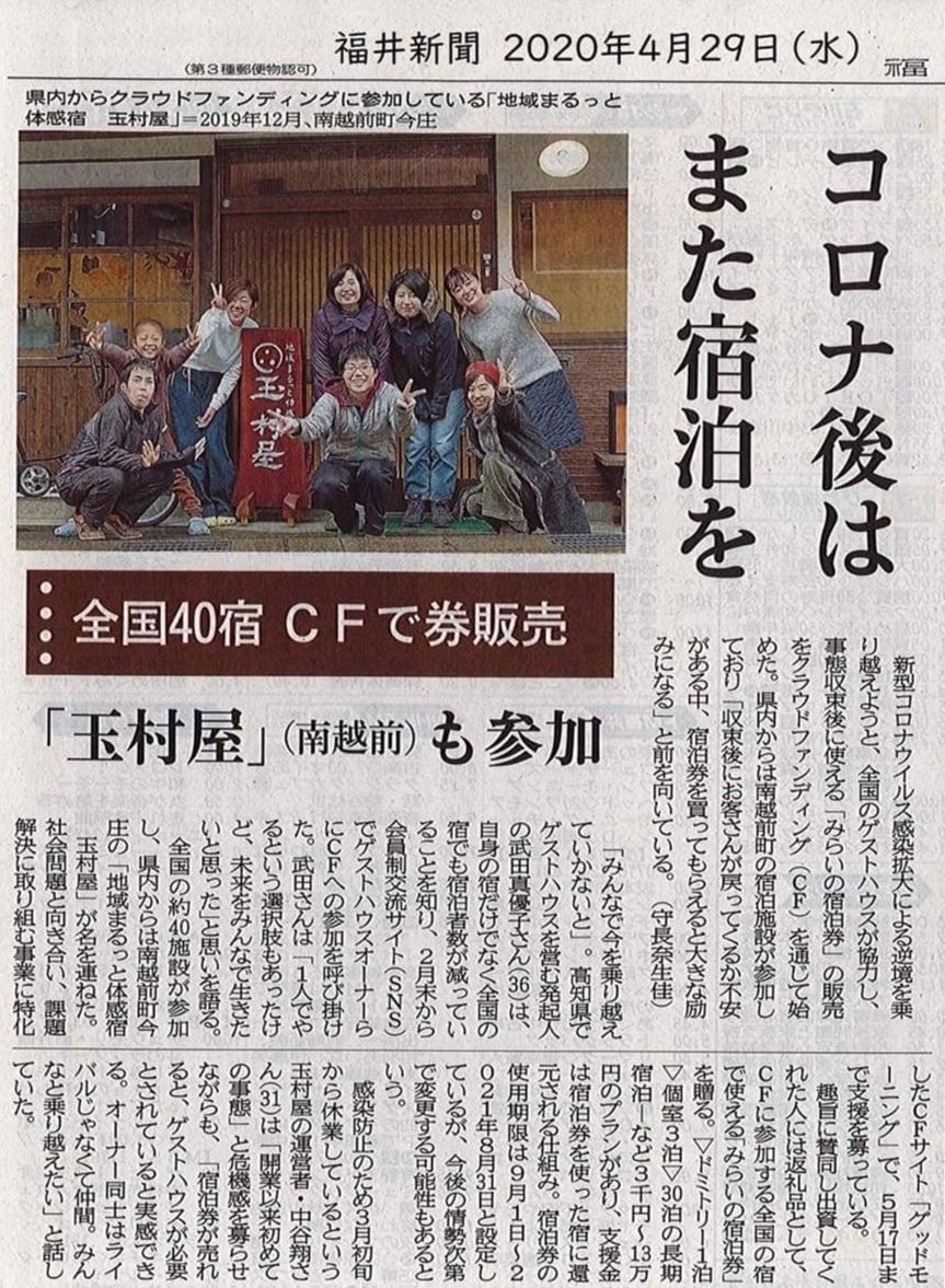 共同企画宿泊施設のひとつである「地域まるっと体感宿 玉村屋 」さんが福井新聞で紹介されました。