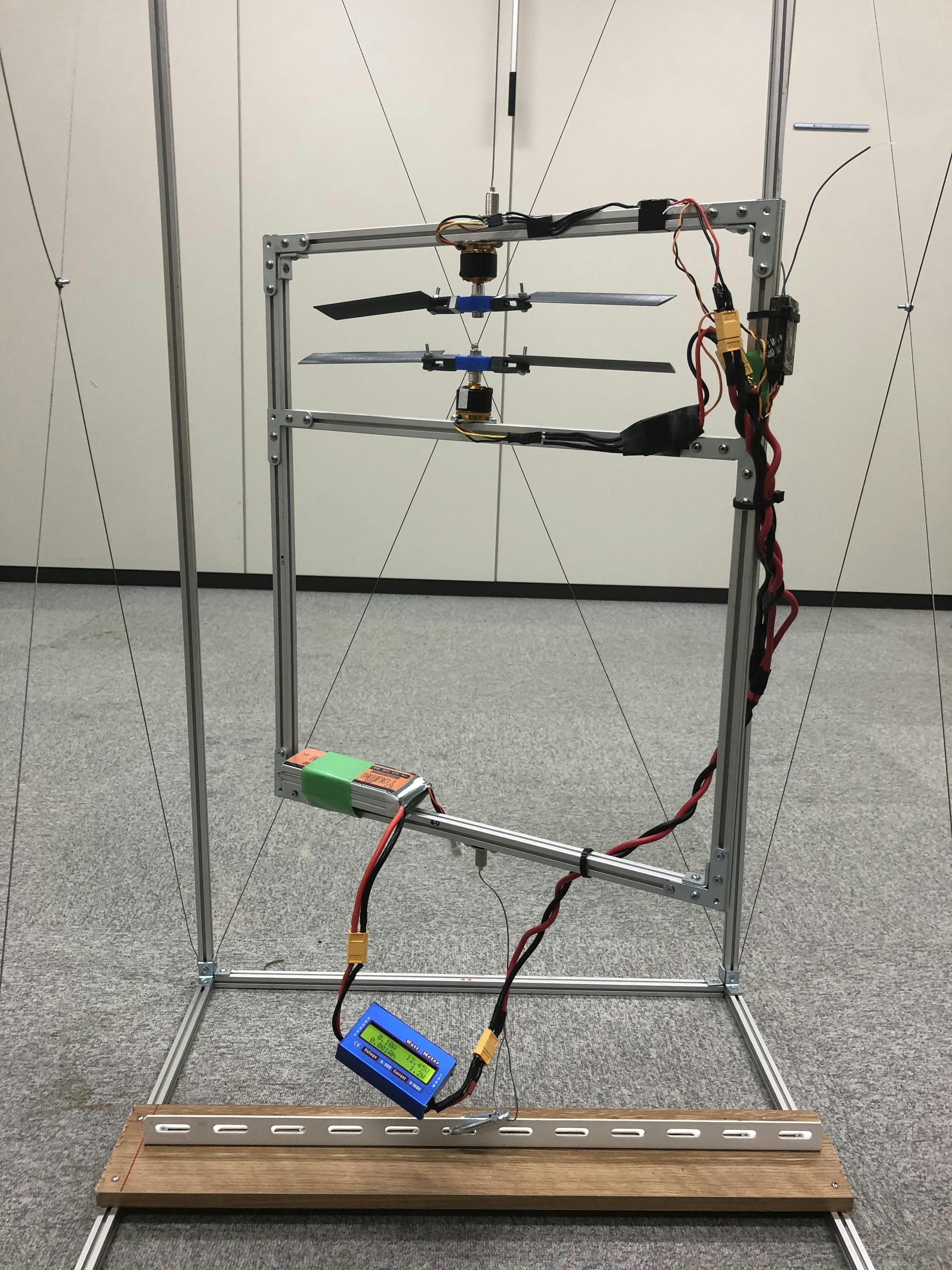 さて、もうお気づきの方も多いかと思いますが、本研究プロジェクトで用いているヘリUAVを火星に持っていっても飛ぶことはできません。このヘリUAVはあくまで、地球上での実験を行うための機体です。火星と地球では大気の密度や成分などの環境が違いすぎるからです。そこで、火星の大気に合わせた翼の形状や配置を研究しています。ただ、この分野は未知の分野であるため、文献を調査したりシミュレーションを使用することが困難です。そこで、私たちは、専用の実験装置を自作し、様々な条件下での実験を行っています。