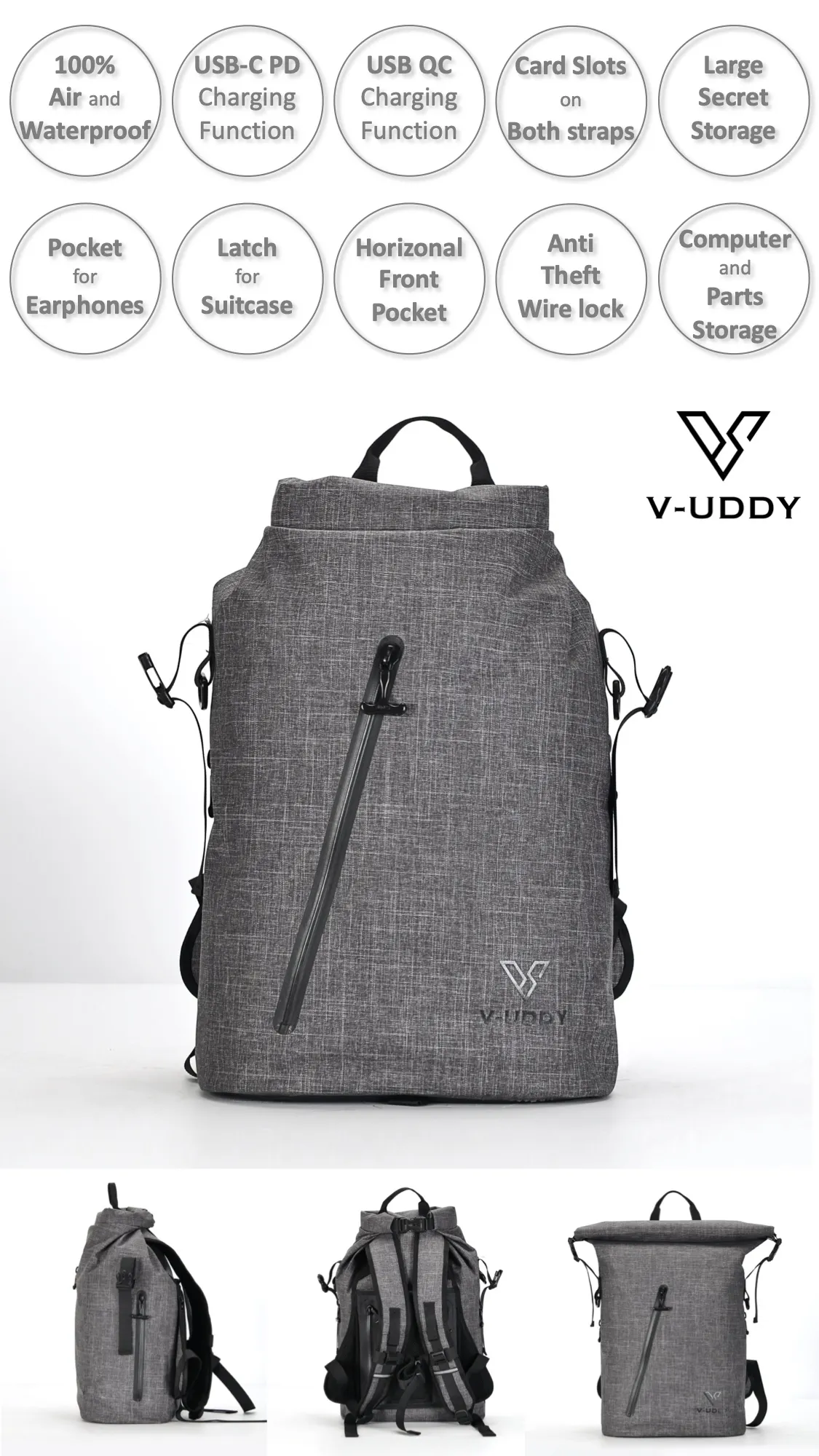 長年にわたり様々なバックパックを使ってきたアメリカ人のバックパックマニアによる監修のもと、V-UDDYプロジェクトチームは、フォーマルでもカジュアルでも使用できる最先端多機能バックパックを開発しました。100%気密防水、USB-C PD充電ポート、USB-A QC充電ポート、シークレットポケット、スーツケースアタッチメント、ワイヤーロック、その他様々な機能を搭載したバックパック【V-UDDY】の魅力を是非堪能してください。