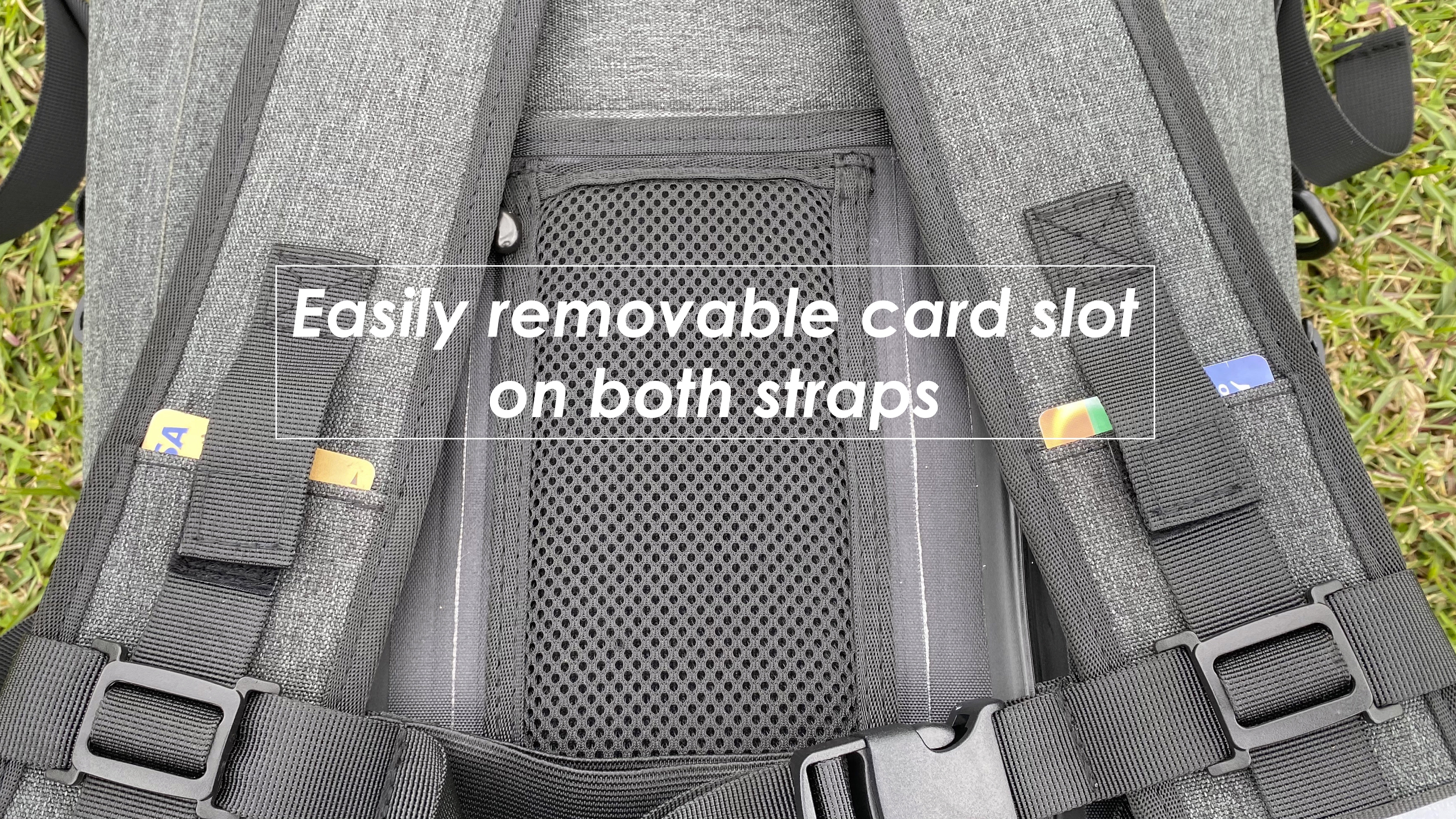 両方のショルダーストラップに、カードスロットを追加しました。よく使用するカードやIDを入れて使用するととても便利です。