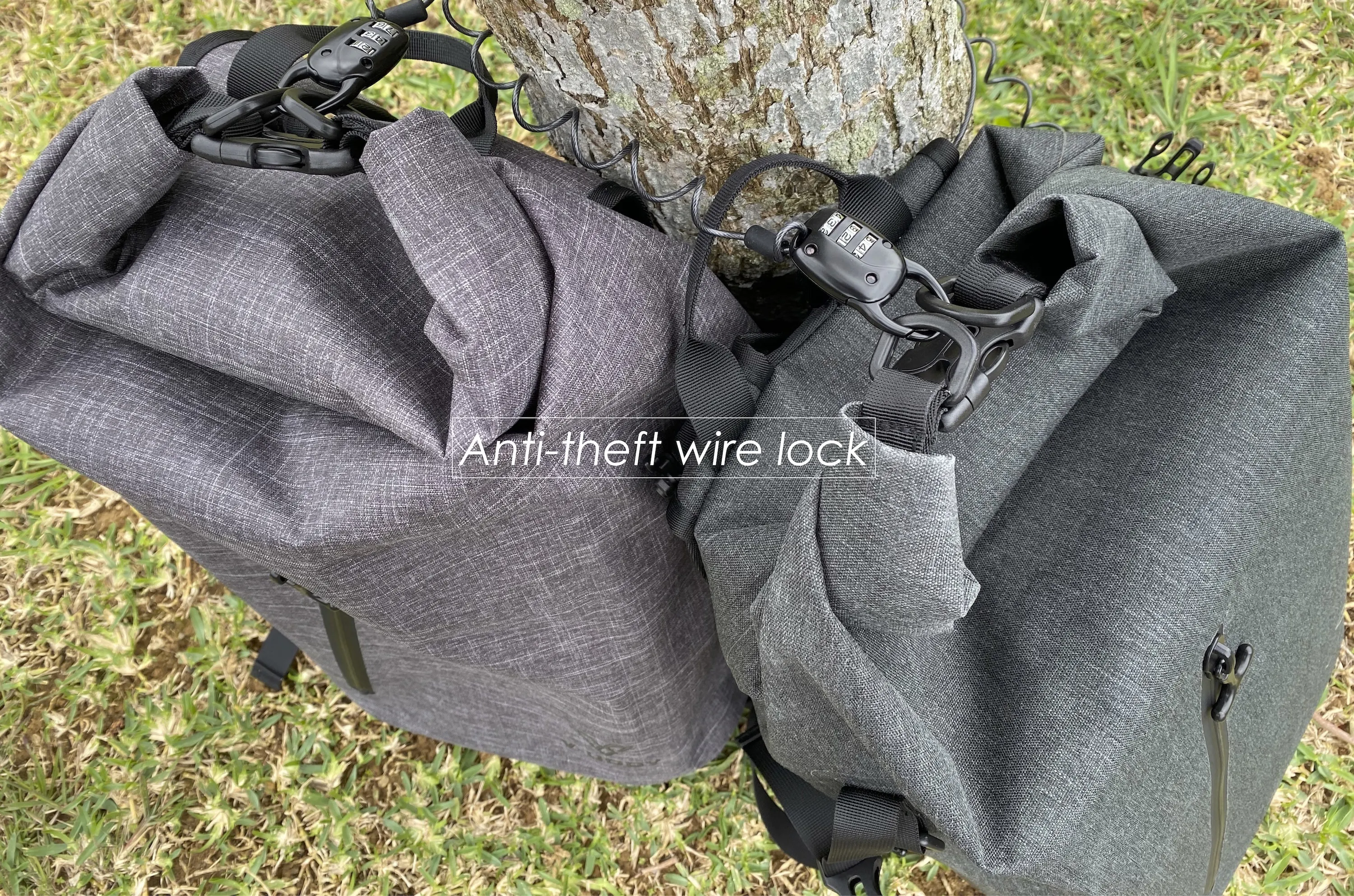 メインポケットを閉じ、右ポケットに収納されたワイヤーロックを施錠すれば、盗難を防ぐことができます。