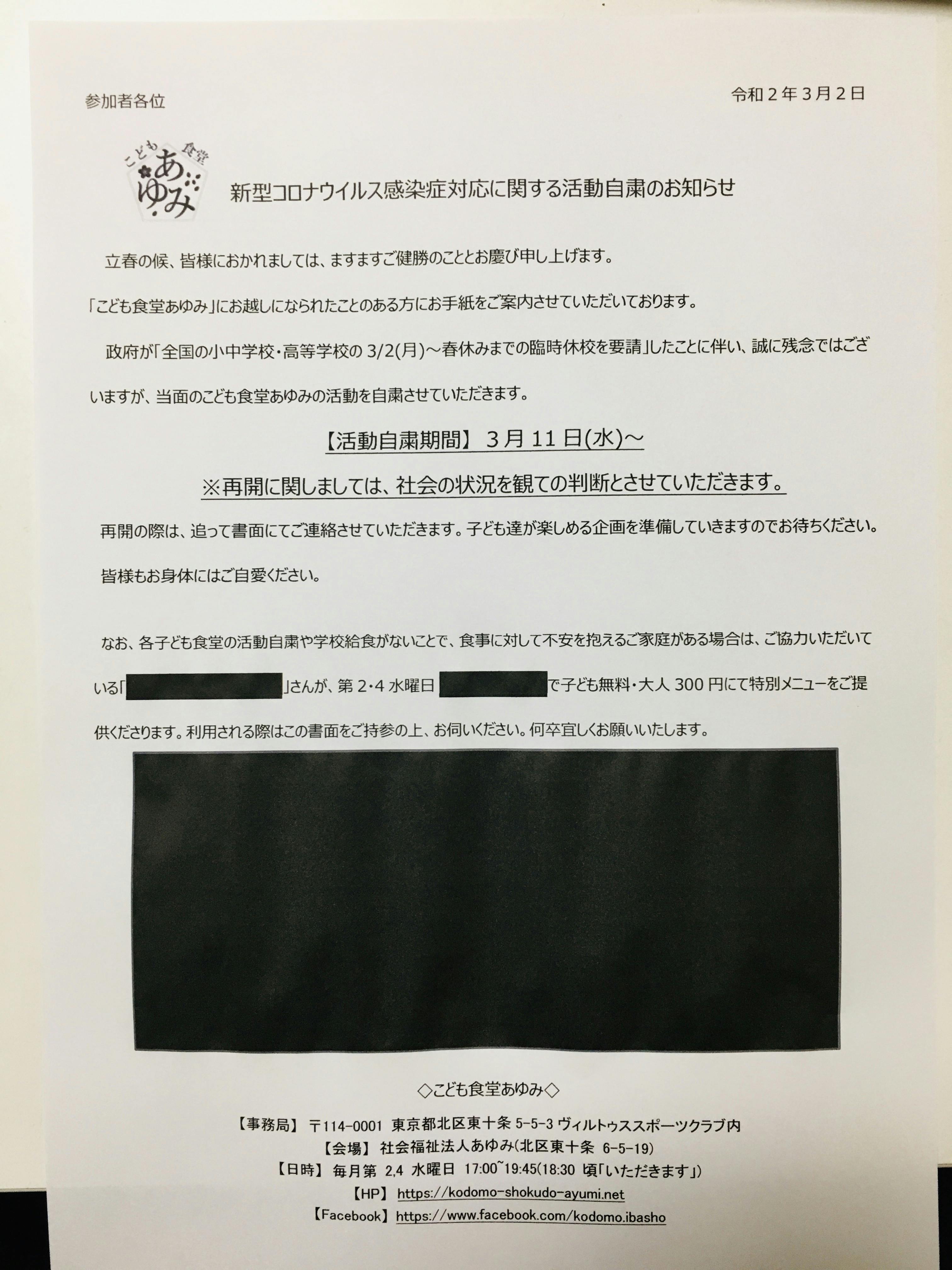 また区内で子ども食堂を運営している団体の情報交換や交流などを目的として「北区子ども食堂ネットワーク」が設立されており、現在は29団体の子ども食堂が加盟しております。この子ども食堂の数は、近隣区と比較してもとても多い数です。求められているからこそ、その地域活動が実施されないとなれば、困る家庭・子ども達が多い状況となることは言うまでもありません。