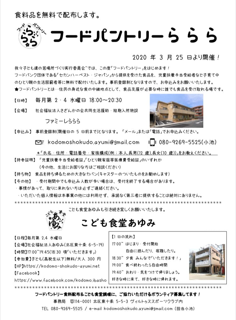 今回の緊急事態で開設する「フードパントリーららら」は、この新型コロナウイルス感染症対策の状況が終息すれば終了ではありません。