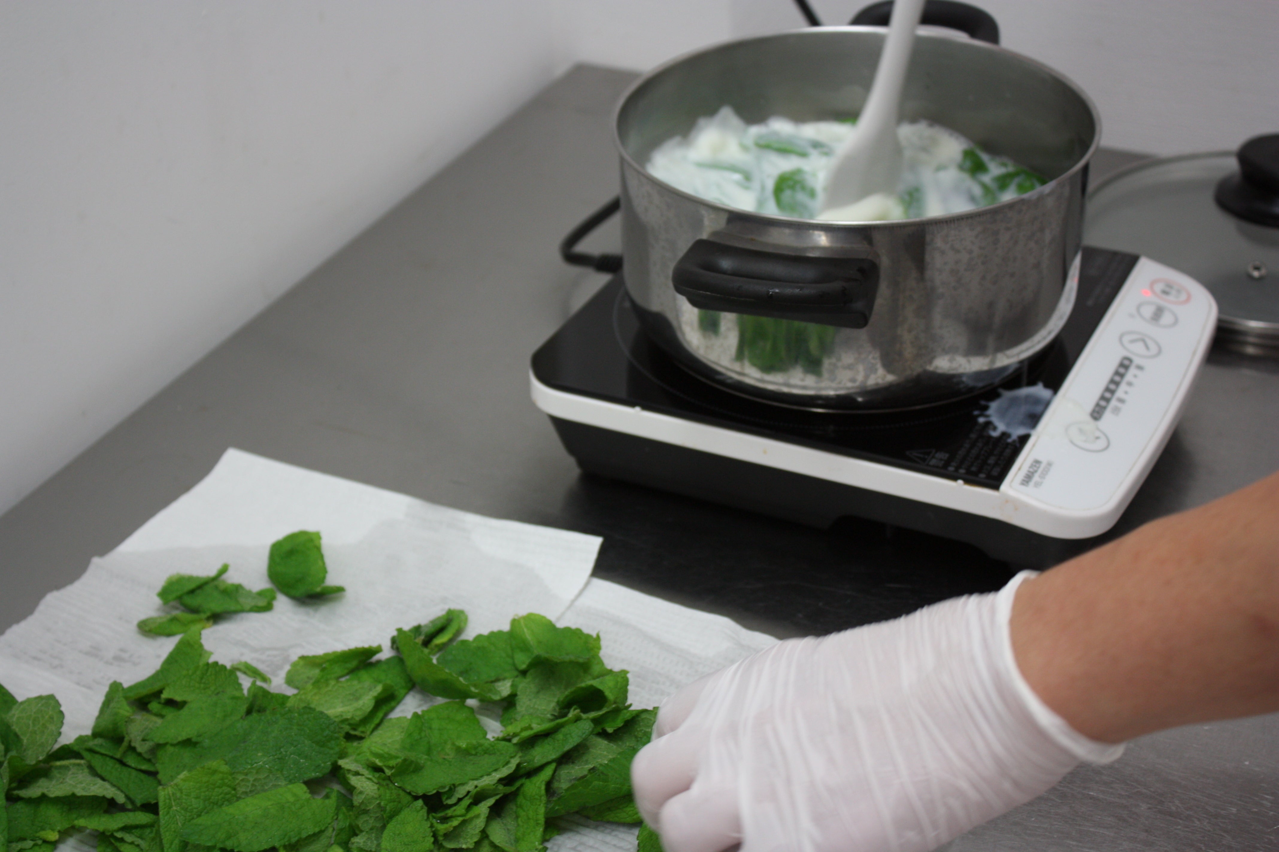 1日目は、温めたミルクにミントを漬け込み、香りを移す作業。