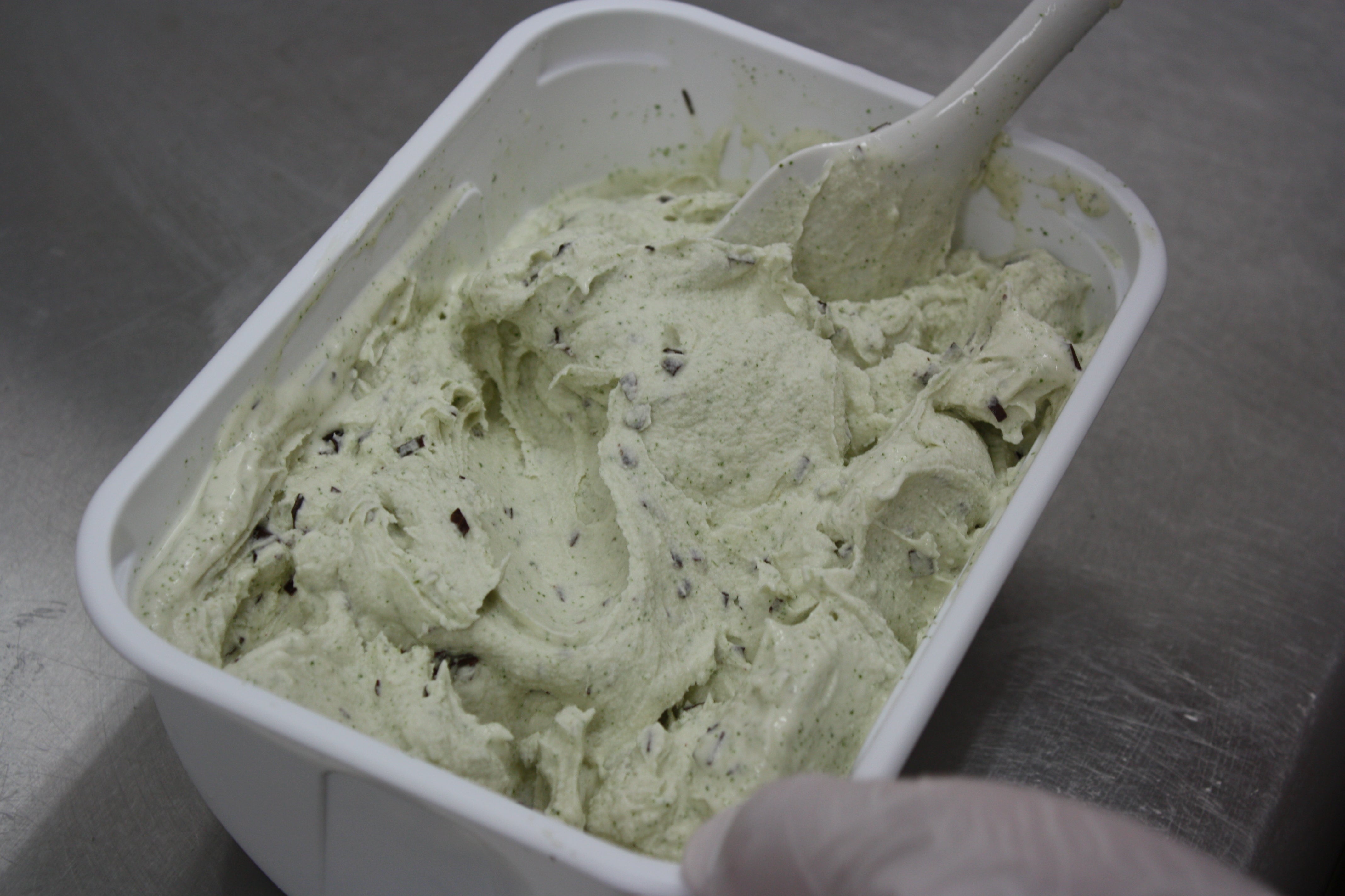 出来上がったミルクベースのミントジェラートに、ビターチョコをプラスして、、、