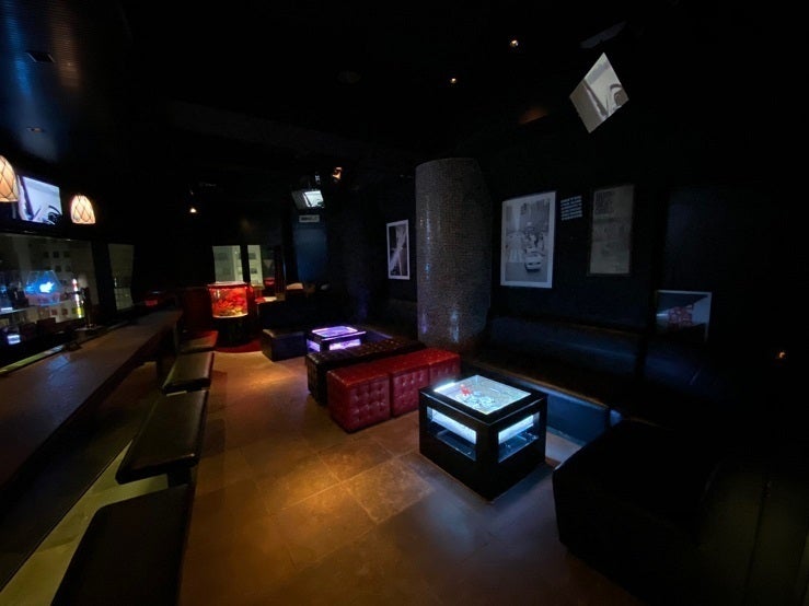 ミッドタウンの夜景を眺めながらお酒を楽しめる立地で、店内のテーブルが水槽であり、海水魚が泳いでいるのが特徴です。