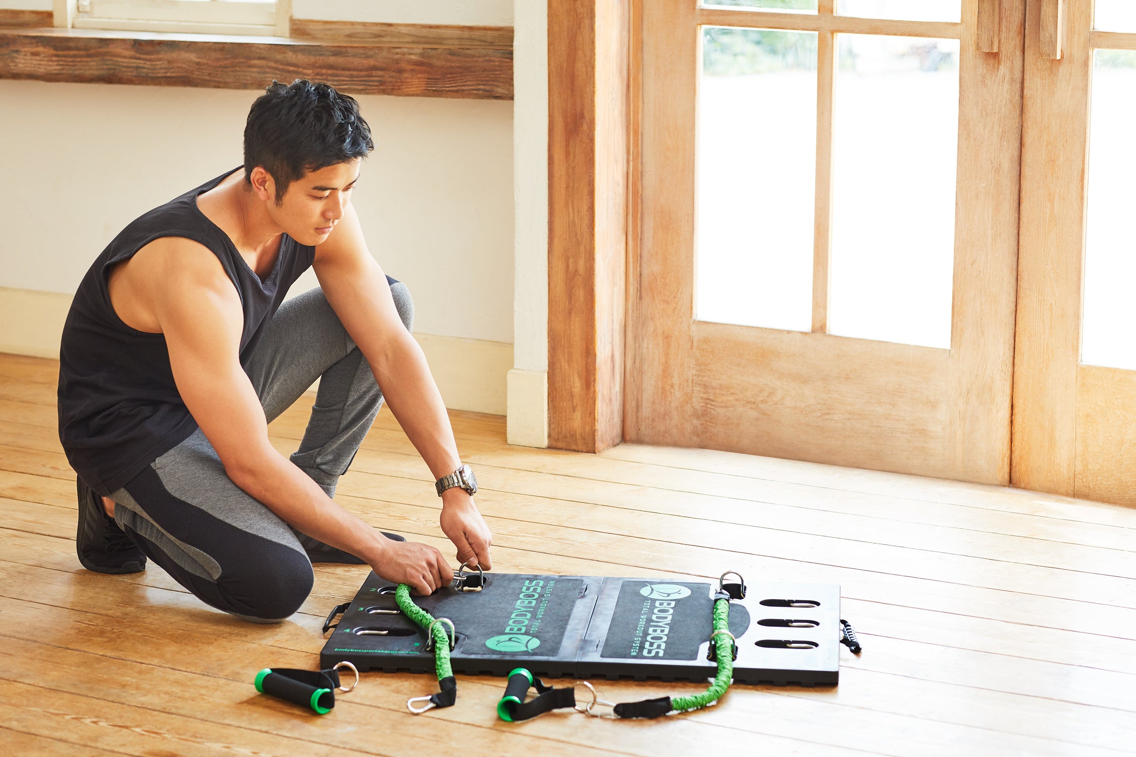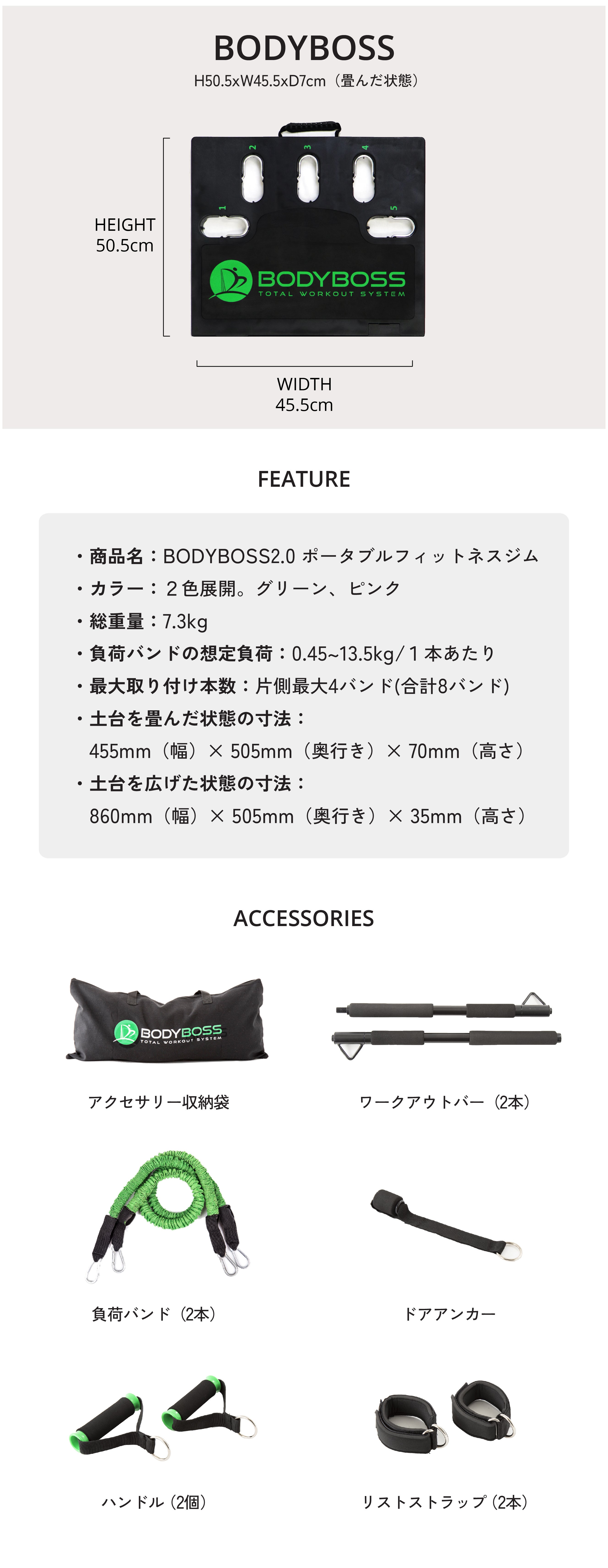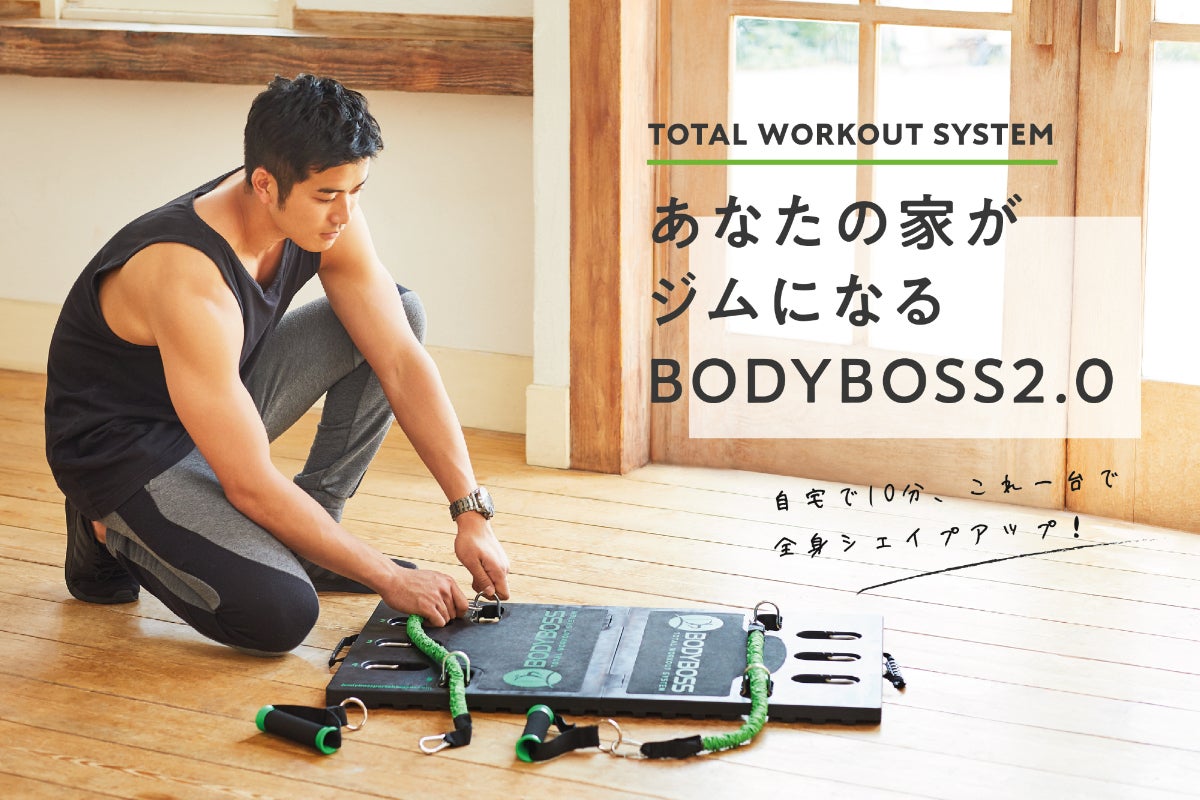 BODYBOSS2.0はジムで見る大型の機器やマシンと同等の機能を持った製品。体を動かしたい、でもジムに行く時間がない、自宅でワークアウトがしたい、そんな悩みを全てを解決してくれるトータルワークアウトシステムです。