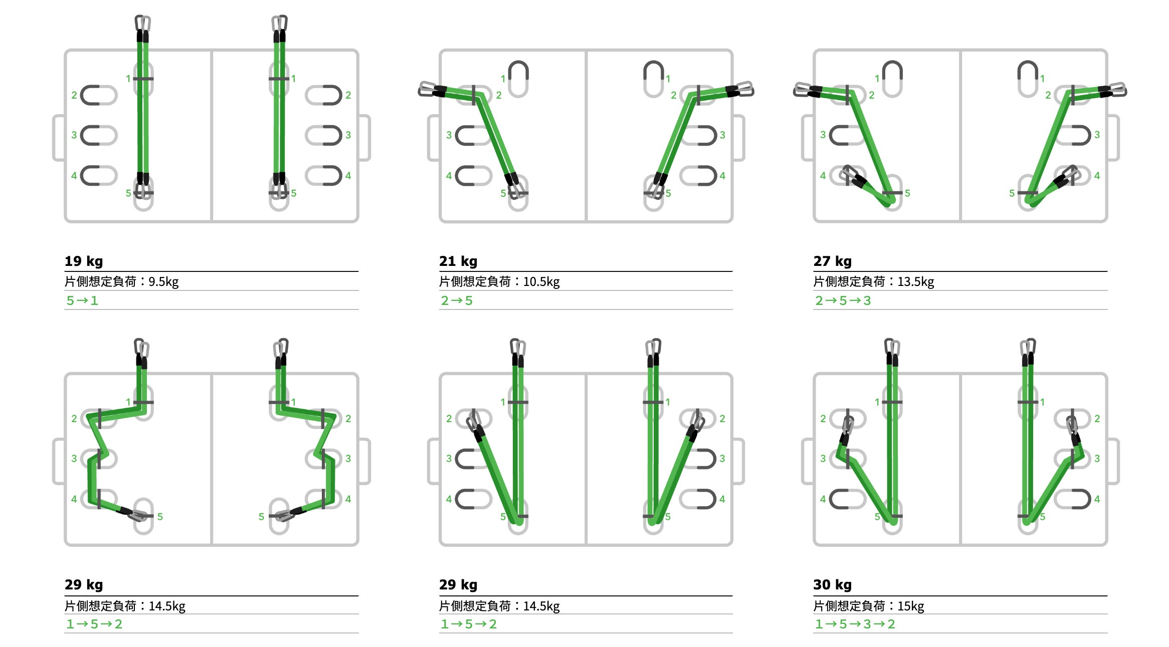 ここでは想定負荷例の一覧を紹介いたします。BODYBOSSのホームページには更にたくさんの調整例が紹介されてます。