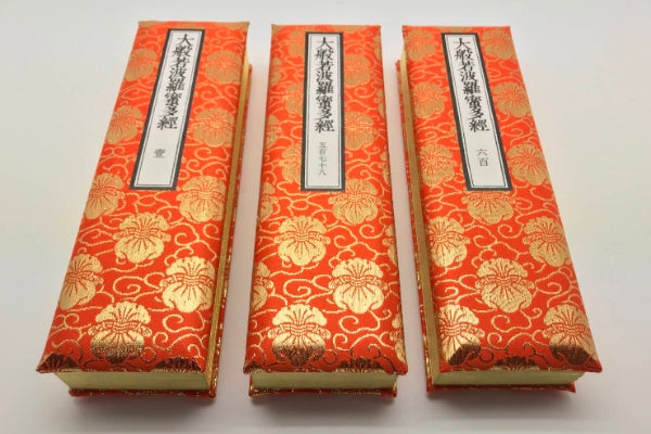 全国でも稀な木版刷りの「大聖歓喜天」宝袋紋に誂えた大般若経典600巻にしたいため、一般的な大般若経に比べて高額な費用が必要になります。