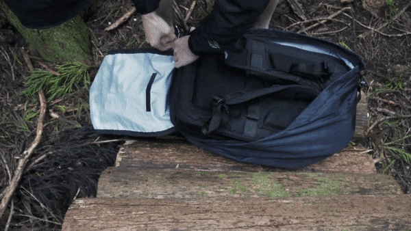 カバーを全て閉じずにバックパック本体のストラップで背負うことで、リュック使用と雨よけを両立できます。