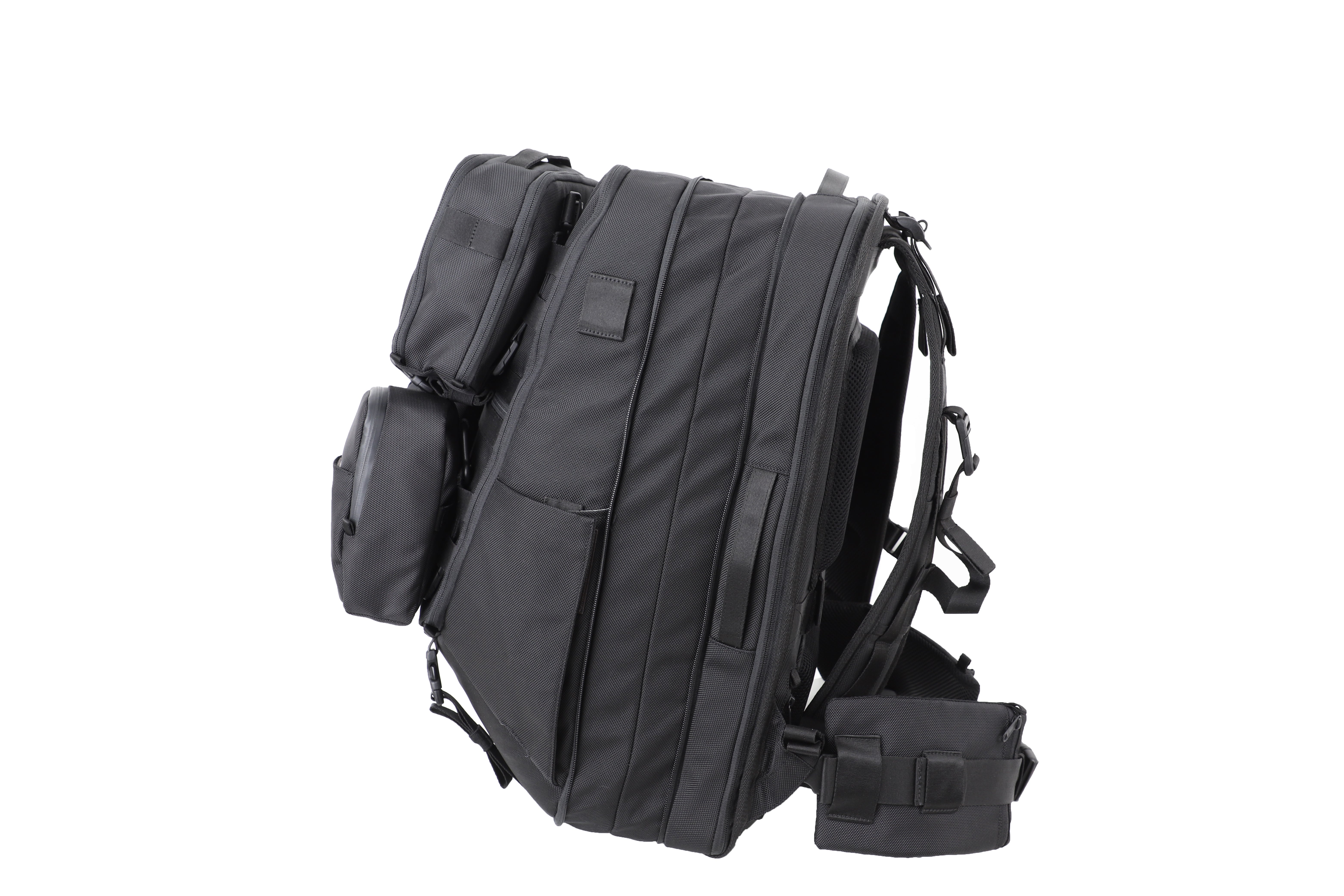 かわいい!とかスマートなタイプの商品がもてはやされている現代において、はっきり言って機能が多すぎるし、無骨で柔らかみがありません。デザインどころか文字やロゴの類もバッグにはなく、完全に黒無地です。