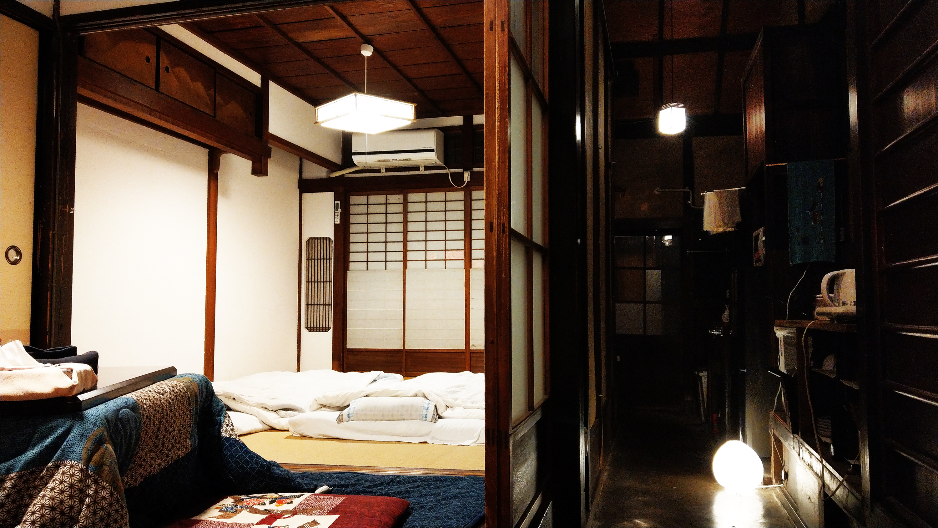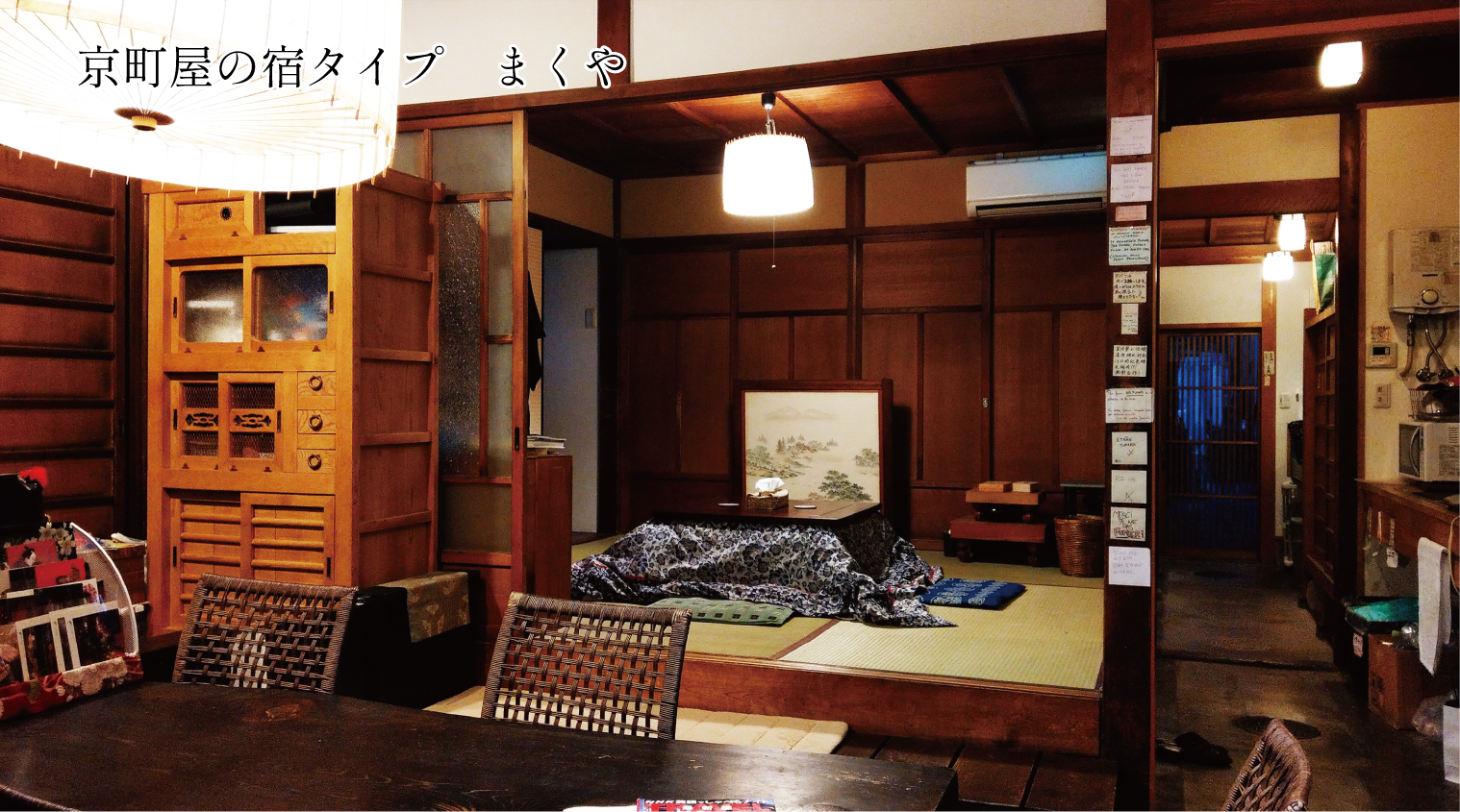 京町家の宿である「まくや」では、快適なシェアとプライベートの両立の為、十分な広さのシェアスペースと各個室をご用意しております。