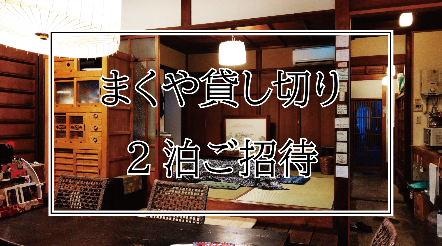 「京町屋ゲストハウスまくや」の貸し切りを2泊分ご招待させて頂きます。10人から15人がご滞在頂ける「まくや」を丸々プライベートに使って頂けます。同窓会やお泊りパーティ等、ご自由にお使い頂けます。一棟貸しホテルのご利用及び貸し切りをご希望でないご利用でお使い頂いても結構です。同じように2泊分ご招待させて頂きます。