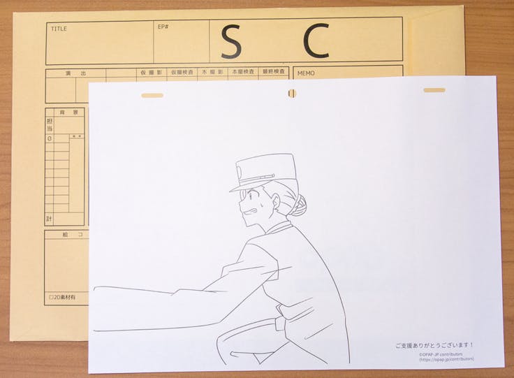 あなたの支援金を使用して制作した素材(キャラ、背景)のいずれか1枚を印刷し、あなたに送付します。なお、当該素材がキャラクターの場合は、アニメーション作画用紙に印刷いたします。