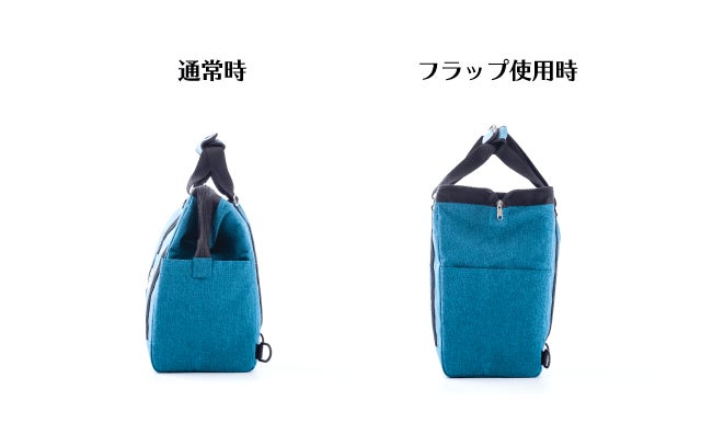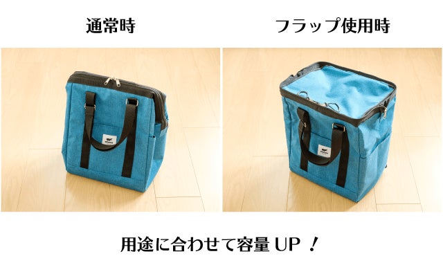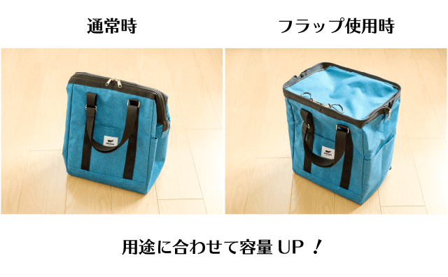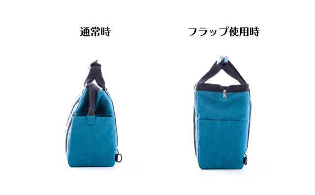 少量ならば、そのままでOK。たくさん詰め込みたいときには、容量を拡張し、フラップで閉められるジッパー仕様。