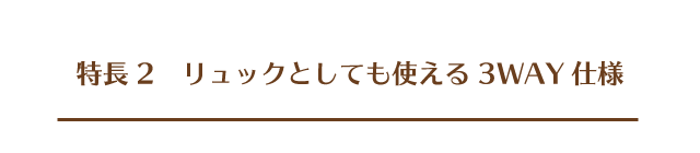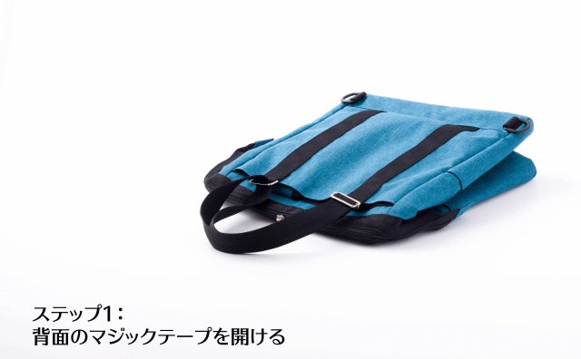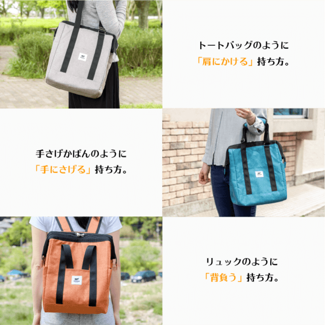手提げ、トート、リュックとして使える3WAY仕様が、「KABAG mini」の大きな特長です。トートからリュックにすれば両手が空くので何かと便利。