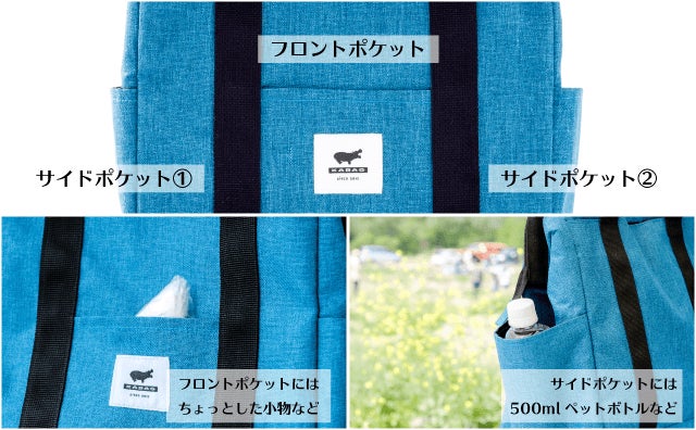フロントポケットにはちょっとした小物等を、サイドポケットにはペットボトルやタオル等を入れられます。