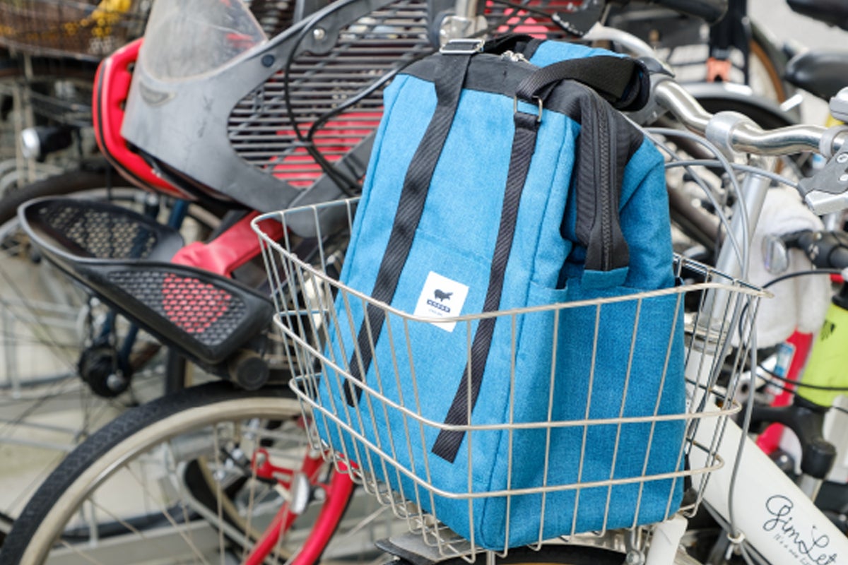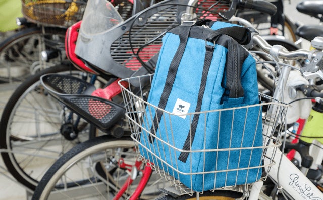 近くのスーパーやショッピングモールに自転車で行くときにも、前かごにおさまるコンパクトサイズの「KABAG mini」は重宝します。